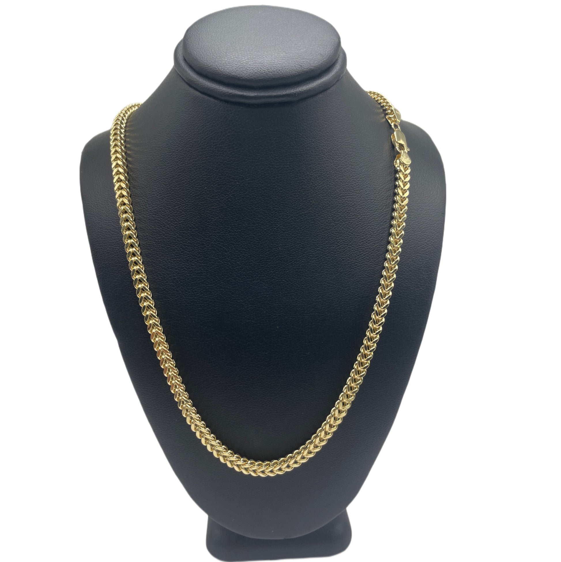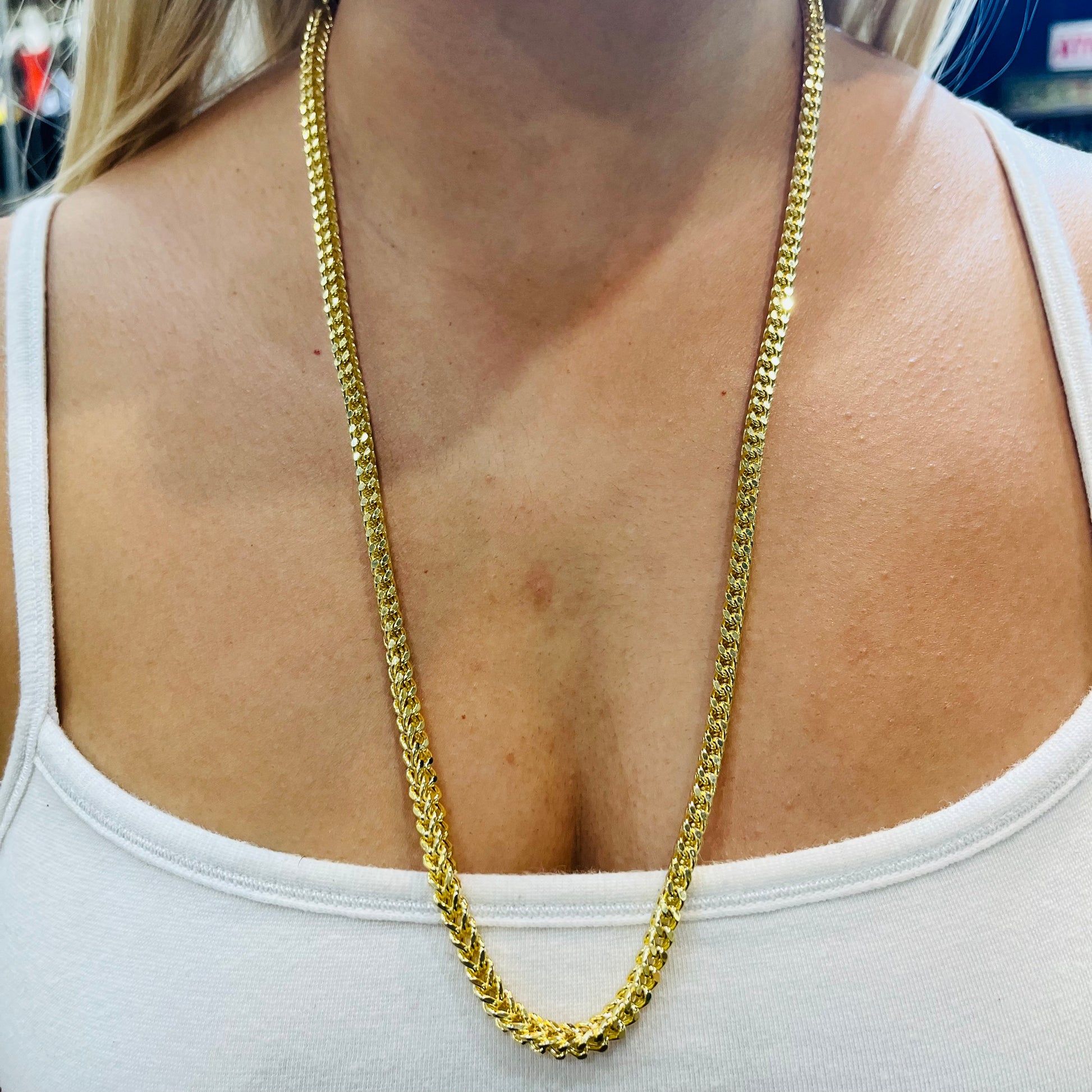 This 10K Gold Hollow 4mm Franco Chain is an absolute must-have. Its sleek and stylish gold design is sure to turn heads and make a statement. Its perfect for both layering or wearing alone.