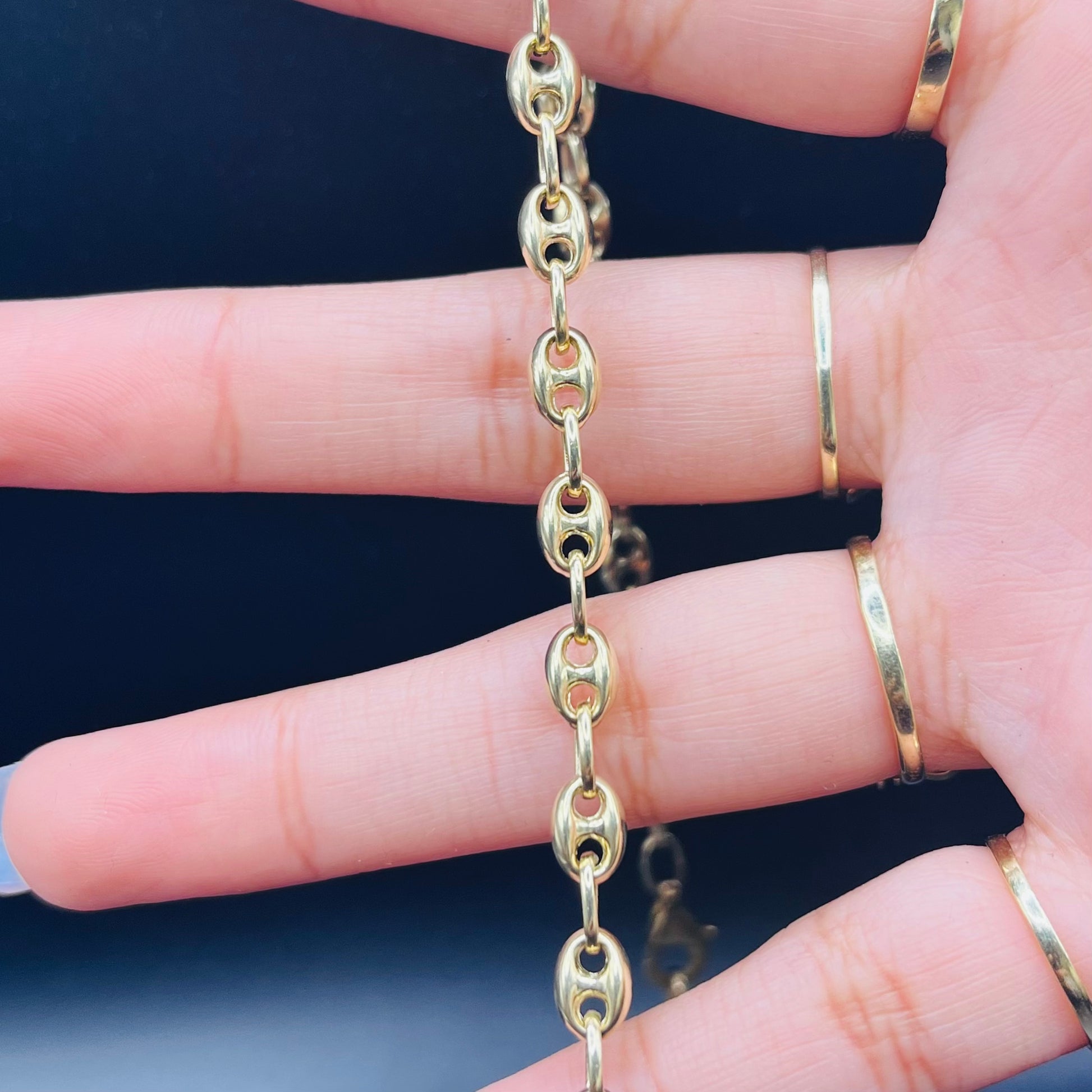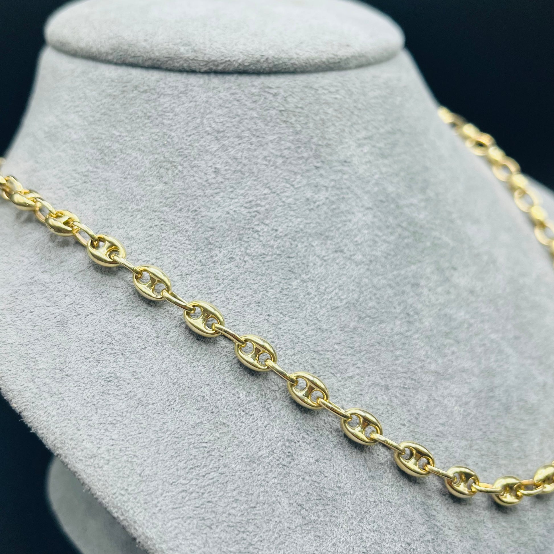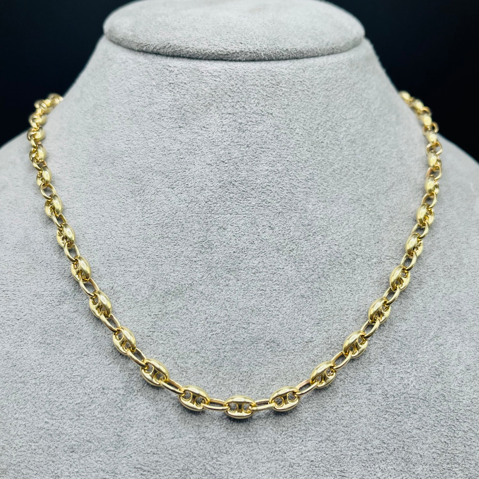 A 10K gold puff link chain features a bold, rounded design with hollow links, offering a lightweight yet striking look.
