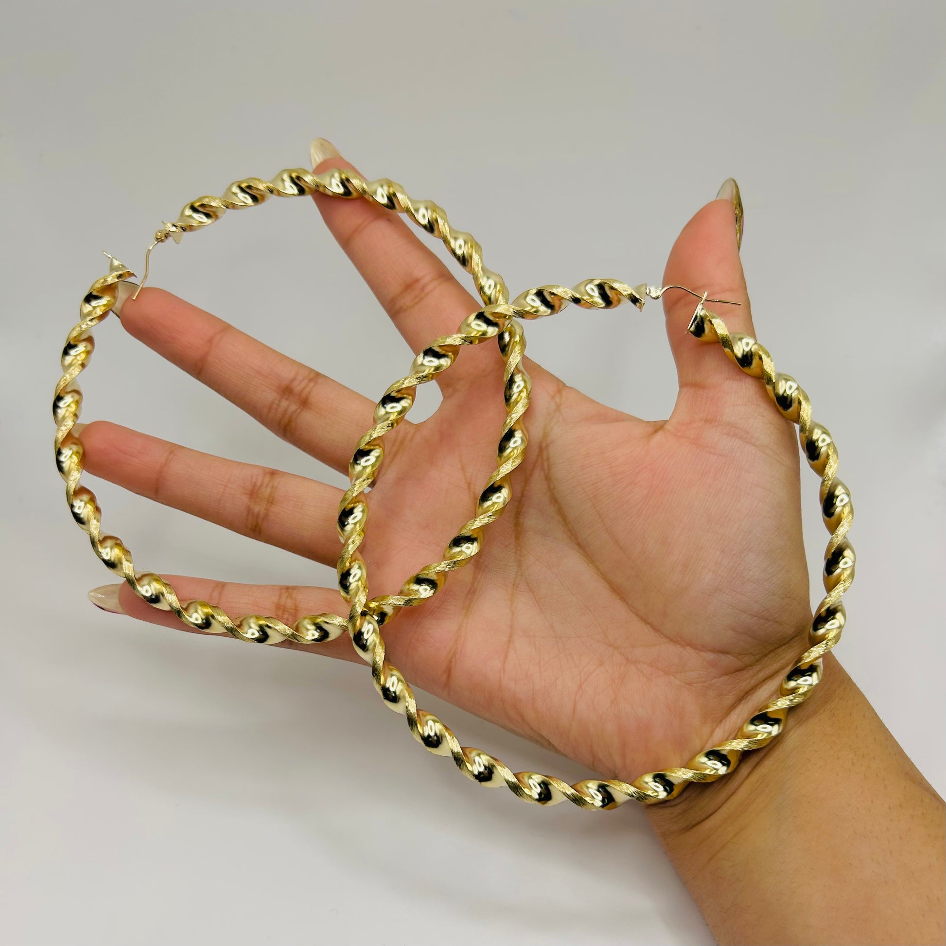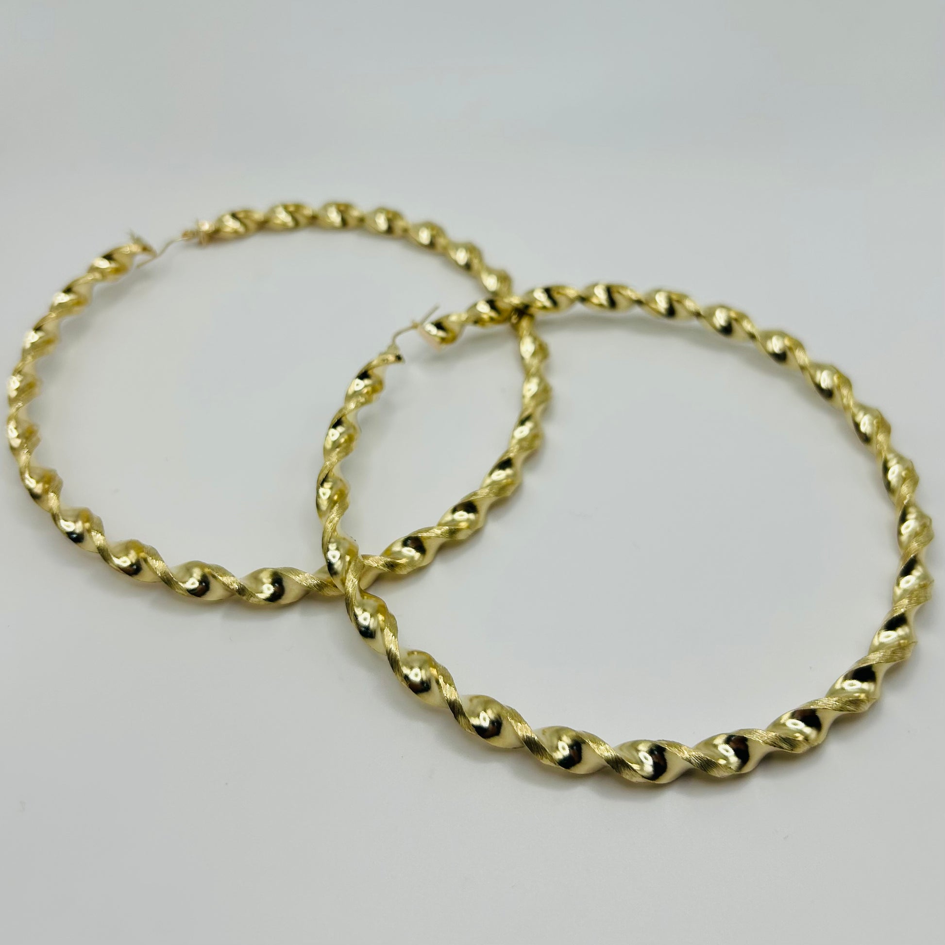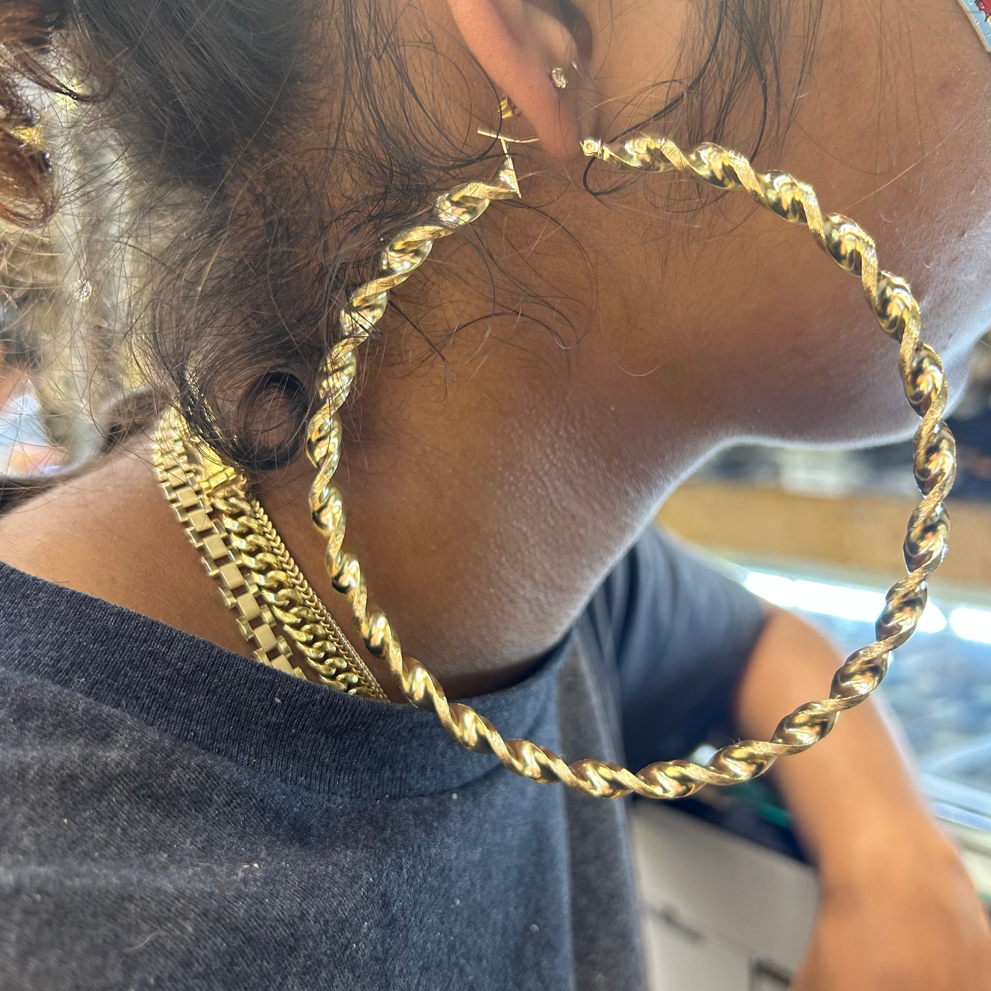 Add a touch of elegance with a modern twist. These Fancy Twist Hoops feature a unique 6mm thick intertwined design that catches the light from every angle, creating a subtle shimmer with every turn. They balance sophistication and style effortlessly in this 4" diameter twist hoop.