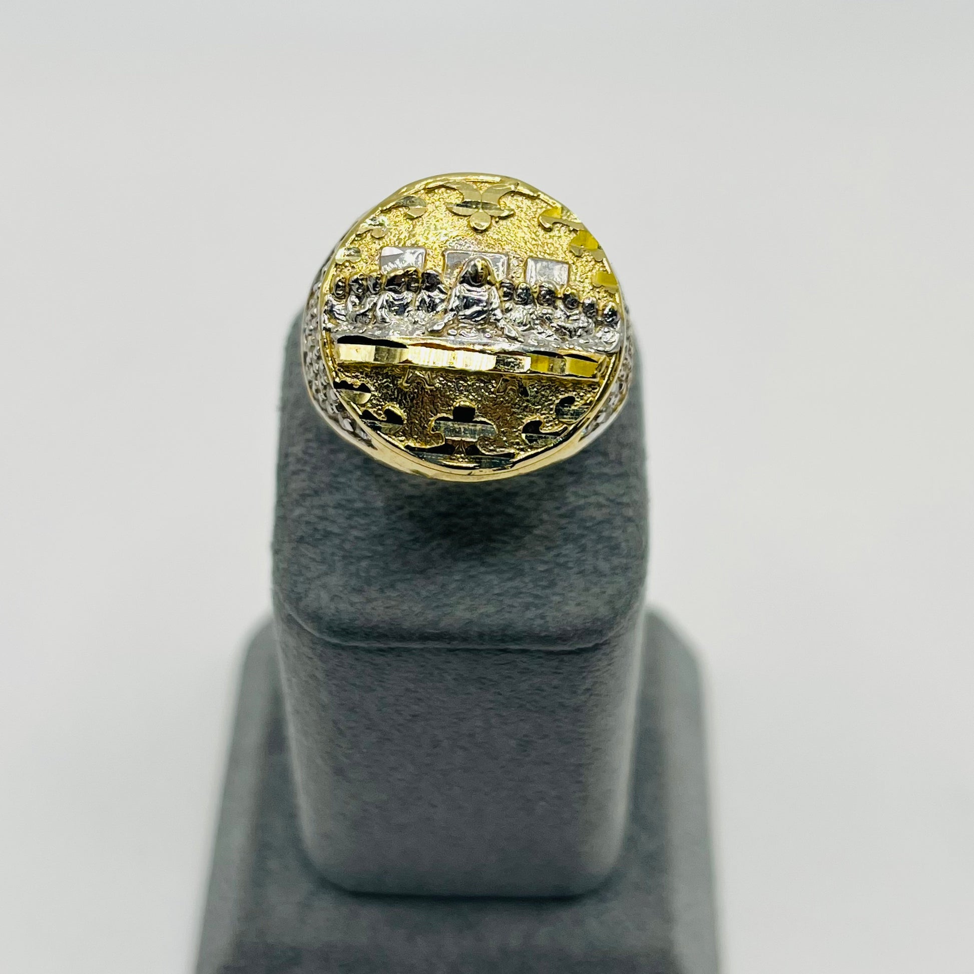 This 10k Gold Blessed Table CZ Band Ring combines timeless elegance with bold style. Featuring a two-tone nugget cut design inspired by the iconic Last Supper motif, it boasts a solid, chunky build for lasting durability. The full band is adorned with dazzling cubic zirconia, adding brilliant sparkle that catches every eye. Perfect for those seeking a meaningful yet striking statement piece, this ring blends craftsmanship and symbolism in one unforgettable accessory.