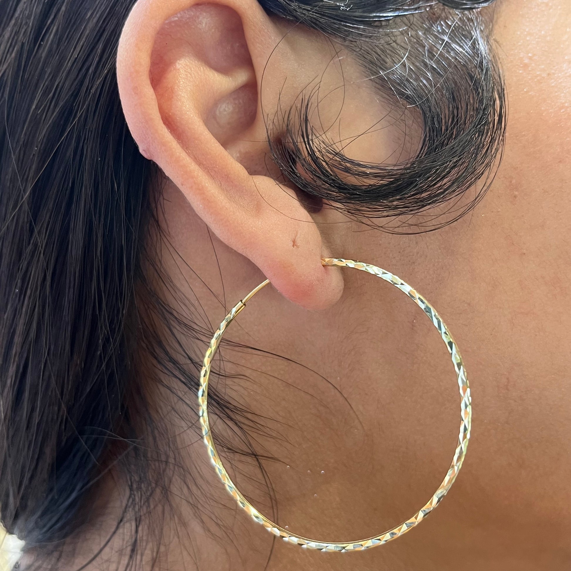 A must have for your earring collection! These endless diamond cut eternity hoops are made of solid 10k gold and are available in multiple sizes. 2.3" in diameter