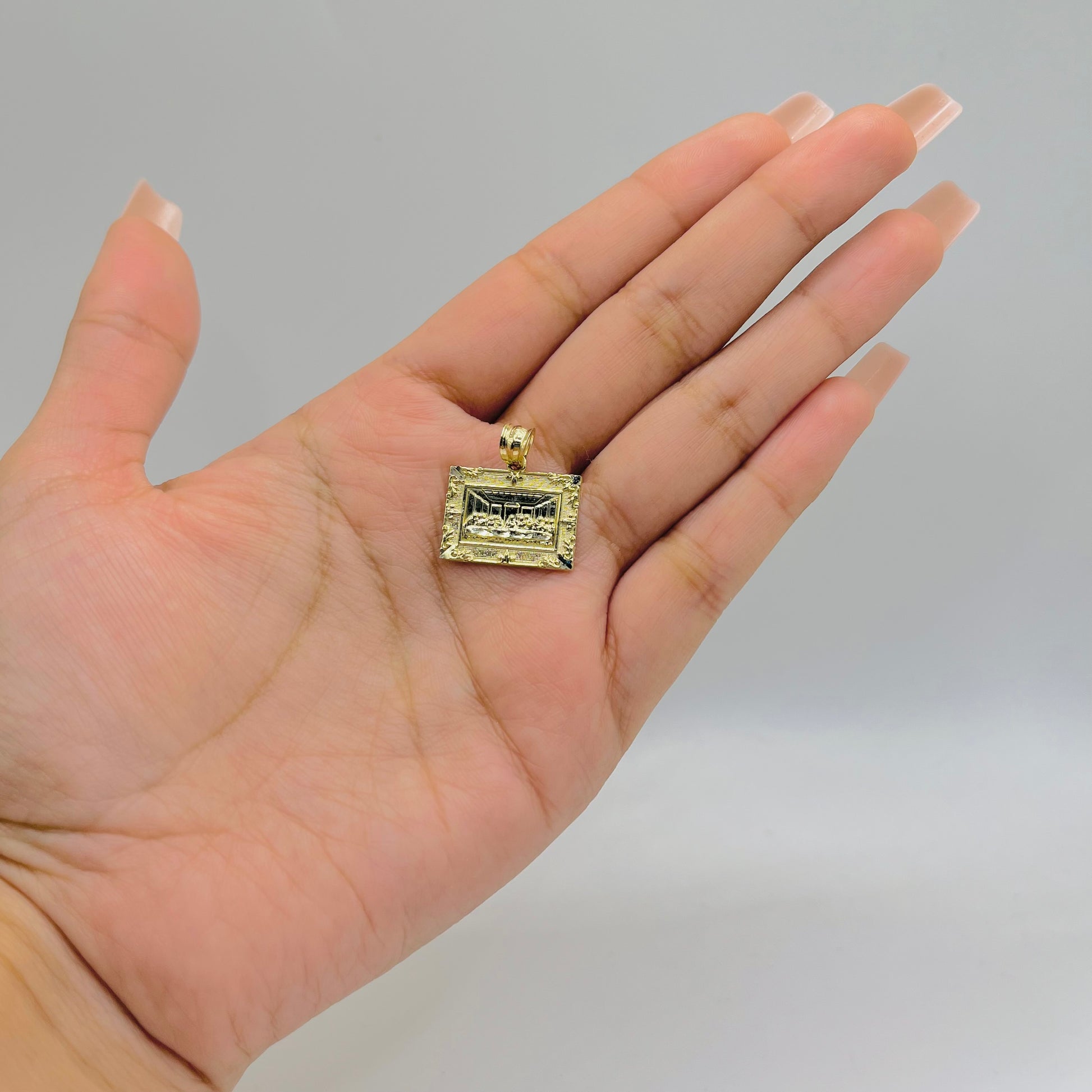 This exquisite 10K gold charm captures the iconic imagery of Leonardo da Vinci's Last Supper within an elegant frame. Crafted from genuine 10K gold, it combines timeless religious artistry with refined jewelry craftsmanship.