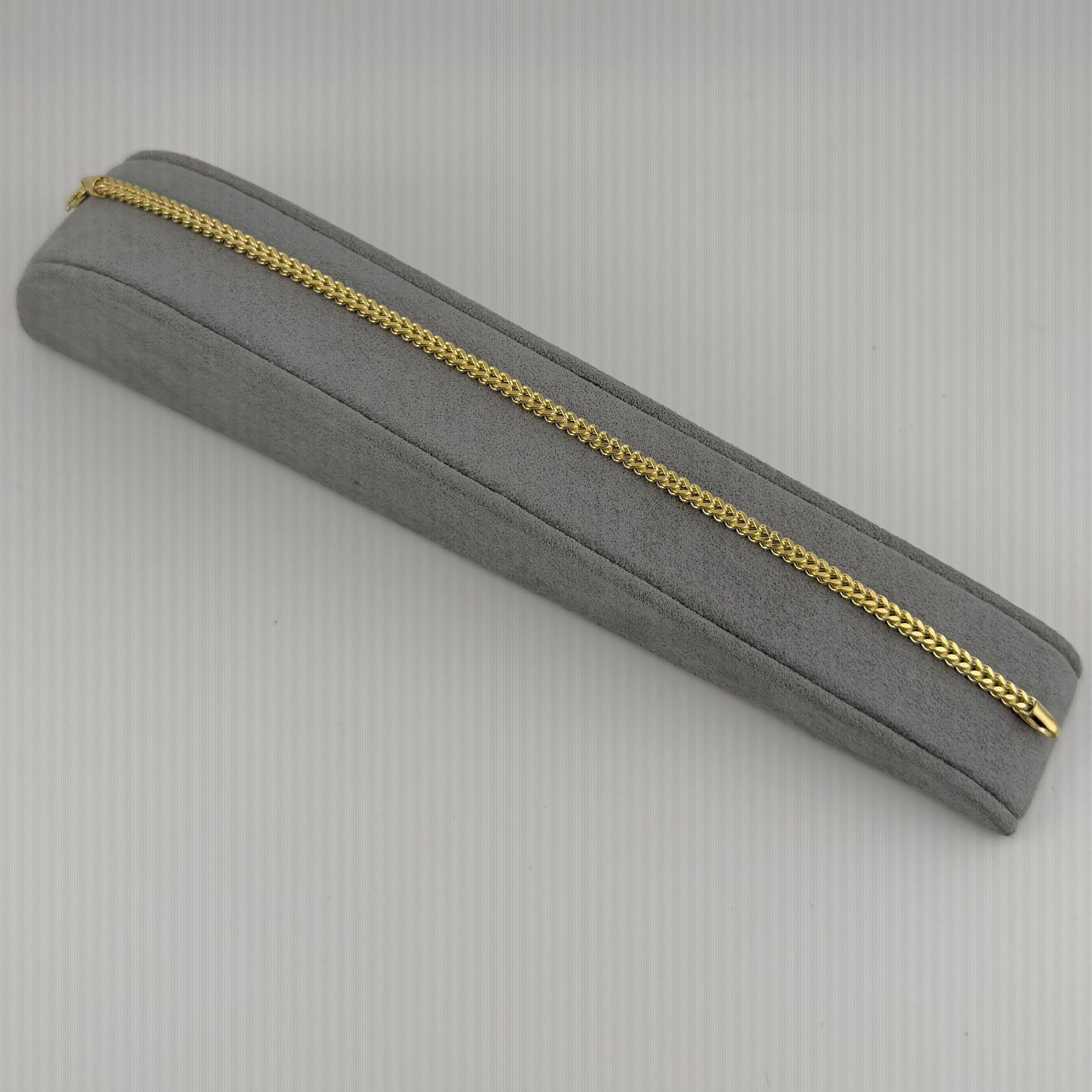 Crafted in 10K gold, this Franco bracelet features a substantial 3.2mm link width—thick enough to feel substantial and durable, yet refined enough for everyday wear. The balanced gauge resists bending while maintaining elegant proportions that work for both men and women. A timeless chain style that won't feel flimsy or overly chunky.