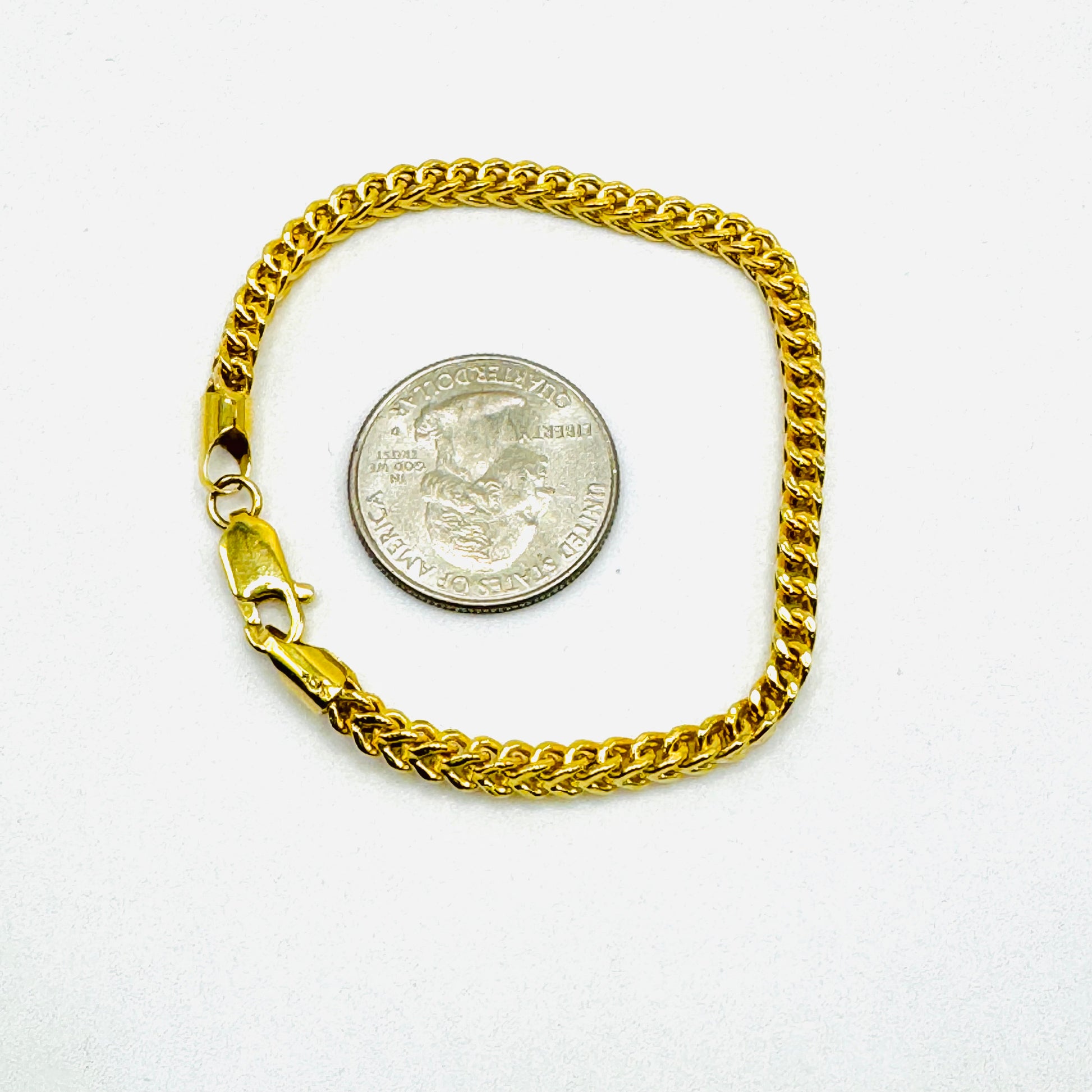 Get ready to amp up your style with the 10K Gold Franco Bracelet! This piece features a 3mm width, offering the perfect blend of subtlety and swagger. Crafted from durable 10K gold, it's a timeless accessory that'll keep you looking fresh for years.