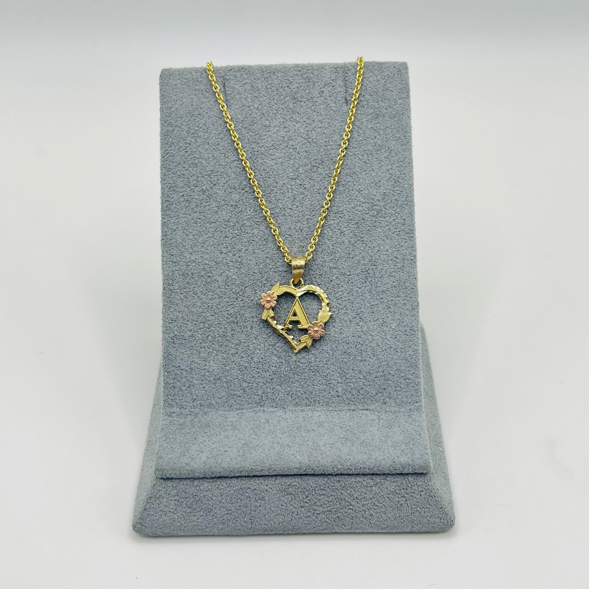 10K Gold Heart with Roses Initial Charm with Rolo Chain