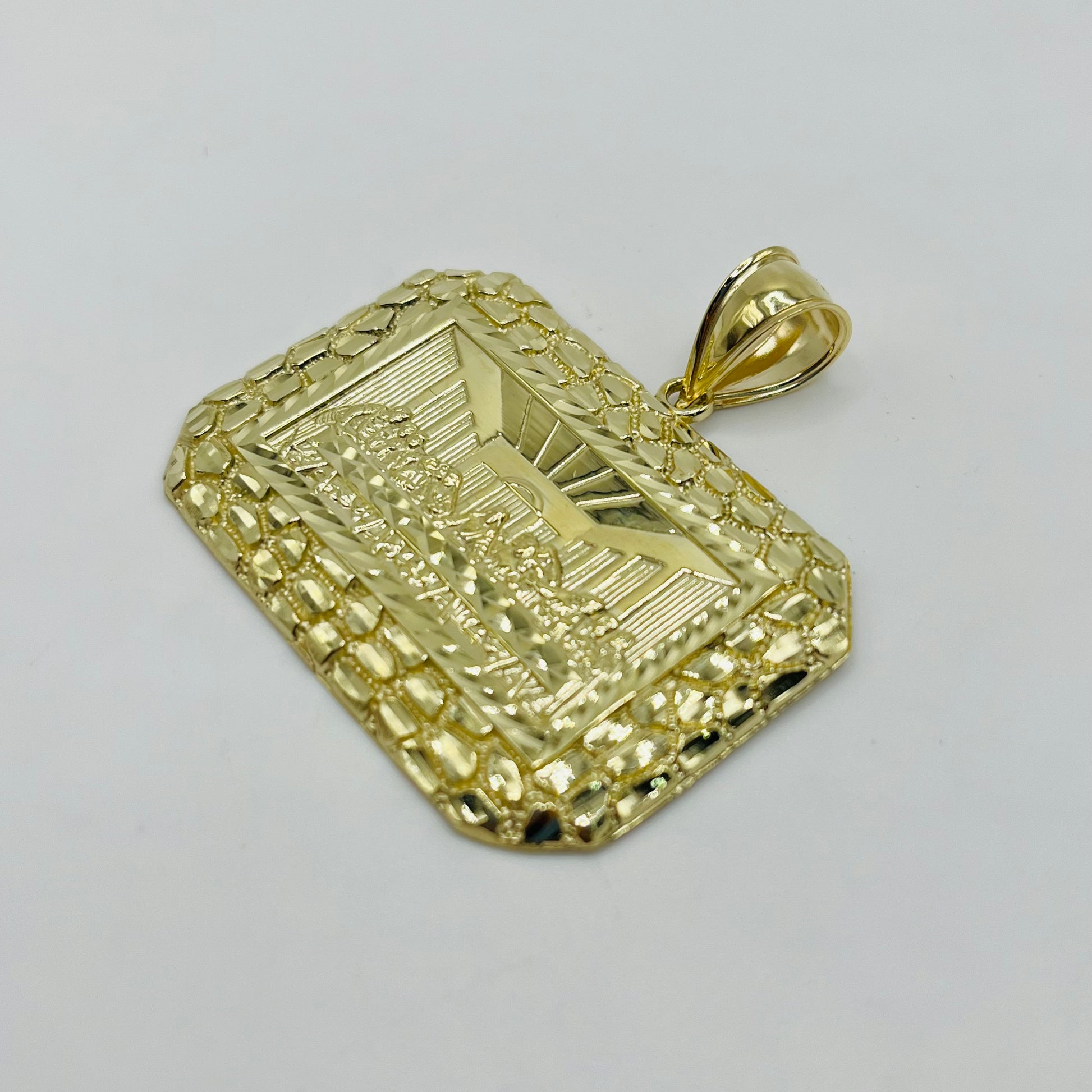 This exquisite 10K Gold Last Supper Nugget Pendant combines religious significance with luxurious craftsmanship. The detailed rectangular design showcases the iconic Last Supper scene, meticulously carved into a premium nugget-style pendant. Make a powerful statement of faith while elevating your style with this eye-catching piece that pairs perfectly with chains of various lengths. An investment in both spiritual symbolism and fine jewelry craftsmanship.