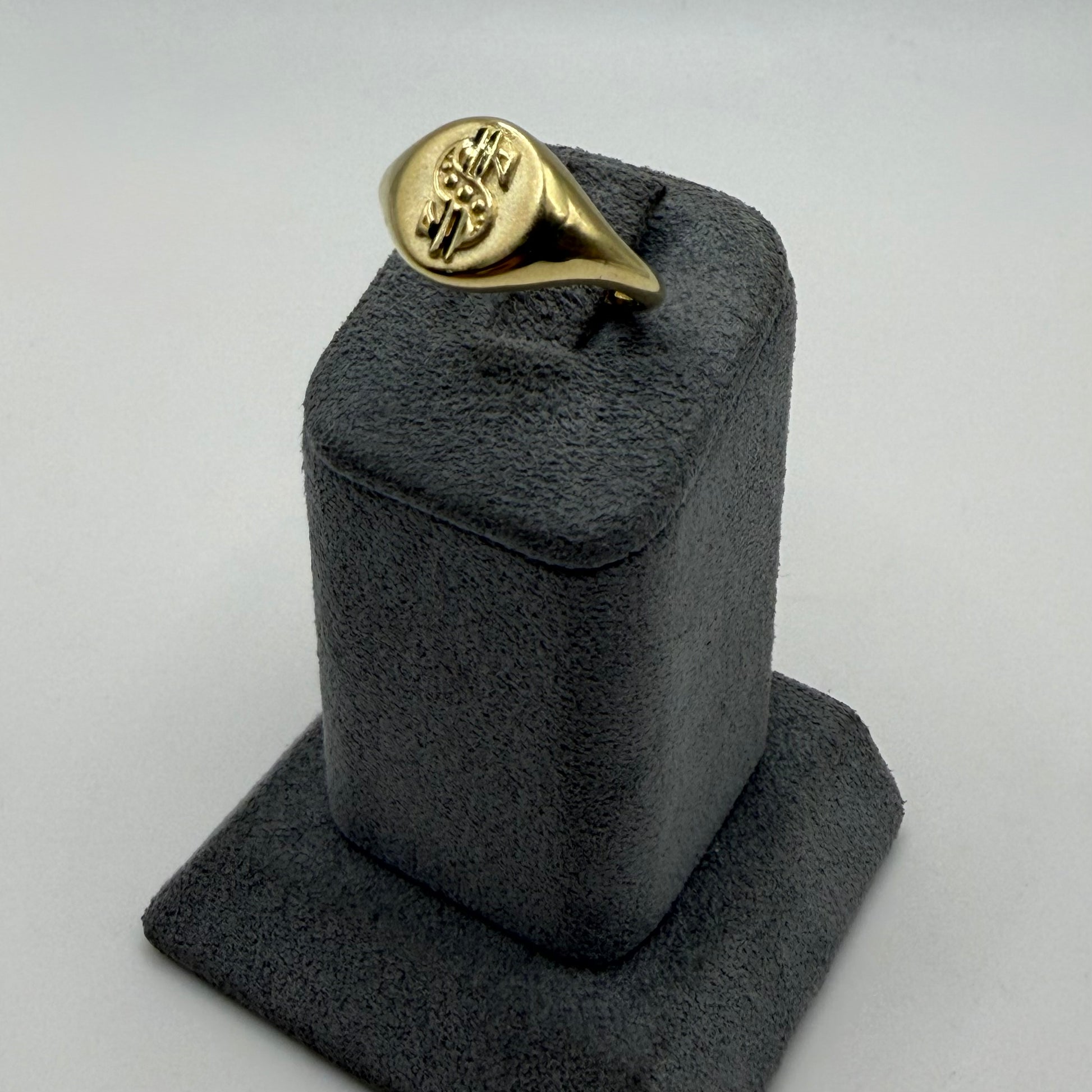 Make a bold statement with this striking 10k gold ring, featuring a matte finish that exudes understated sophistication. The distinctive money-sign design sits prominently on an oval band, creating an eye-catching piece that celebrates success and ambition. The matte texture adds modern edge while the warm glow of 10k gold ensures lasting quality and wearability. Perfect for those who appreciate meaningful symbolism paired with refined craftsmanship.