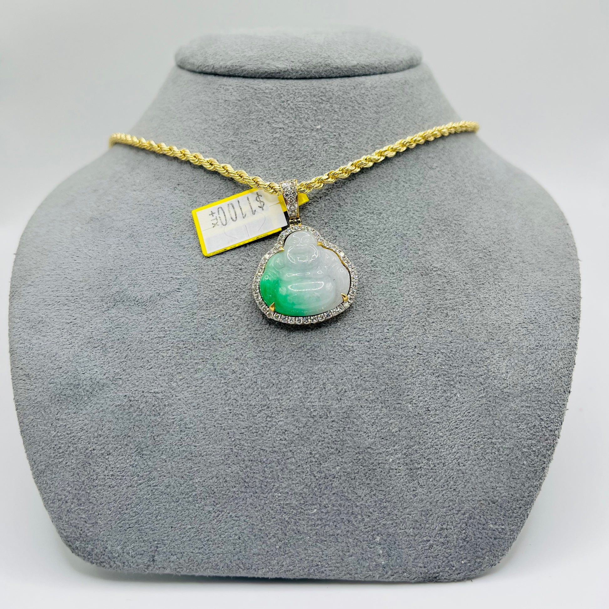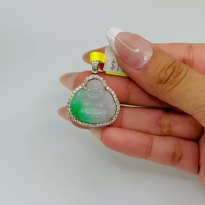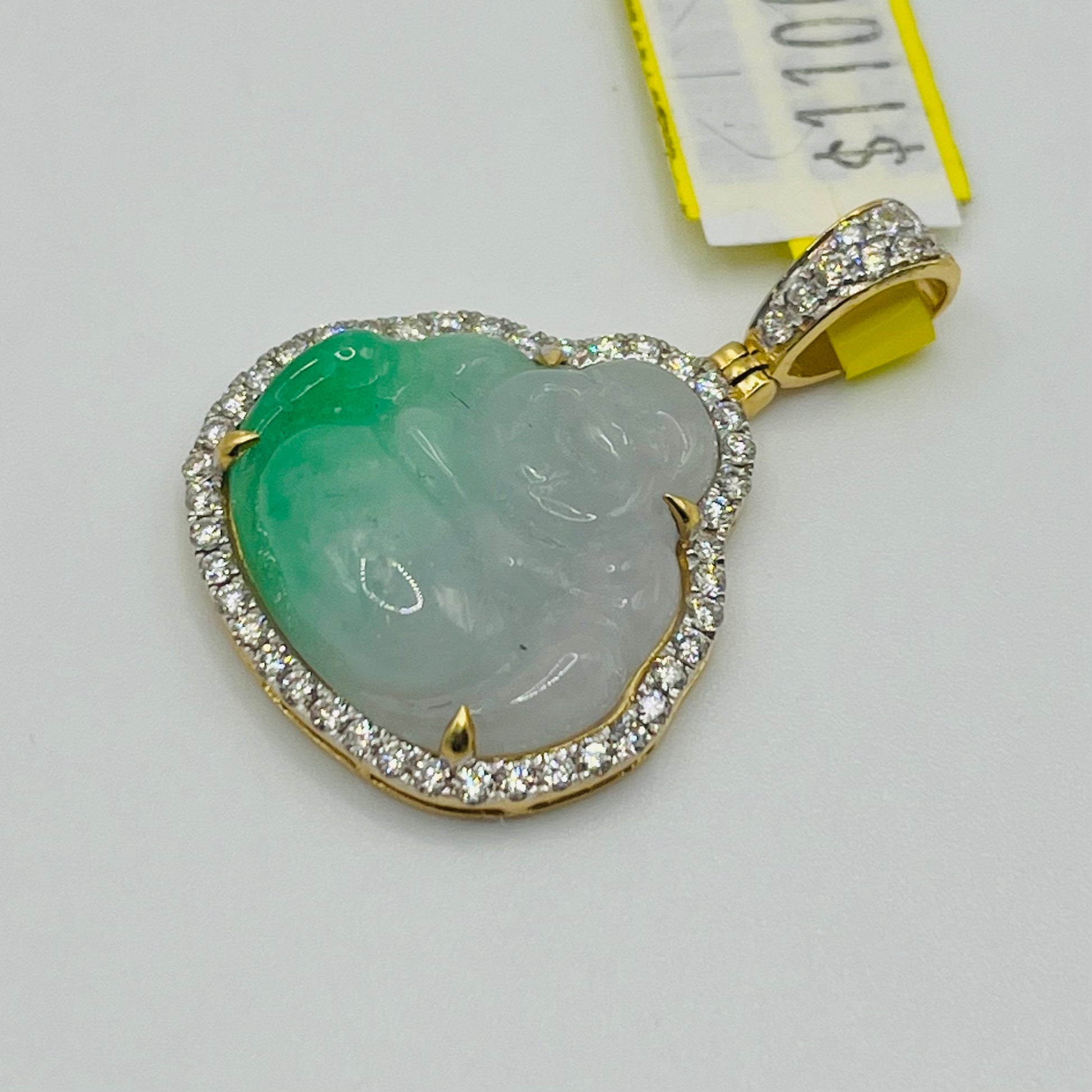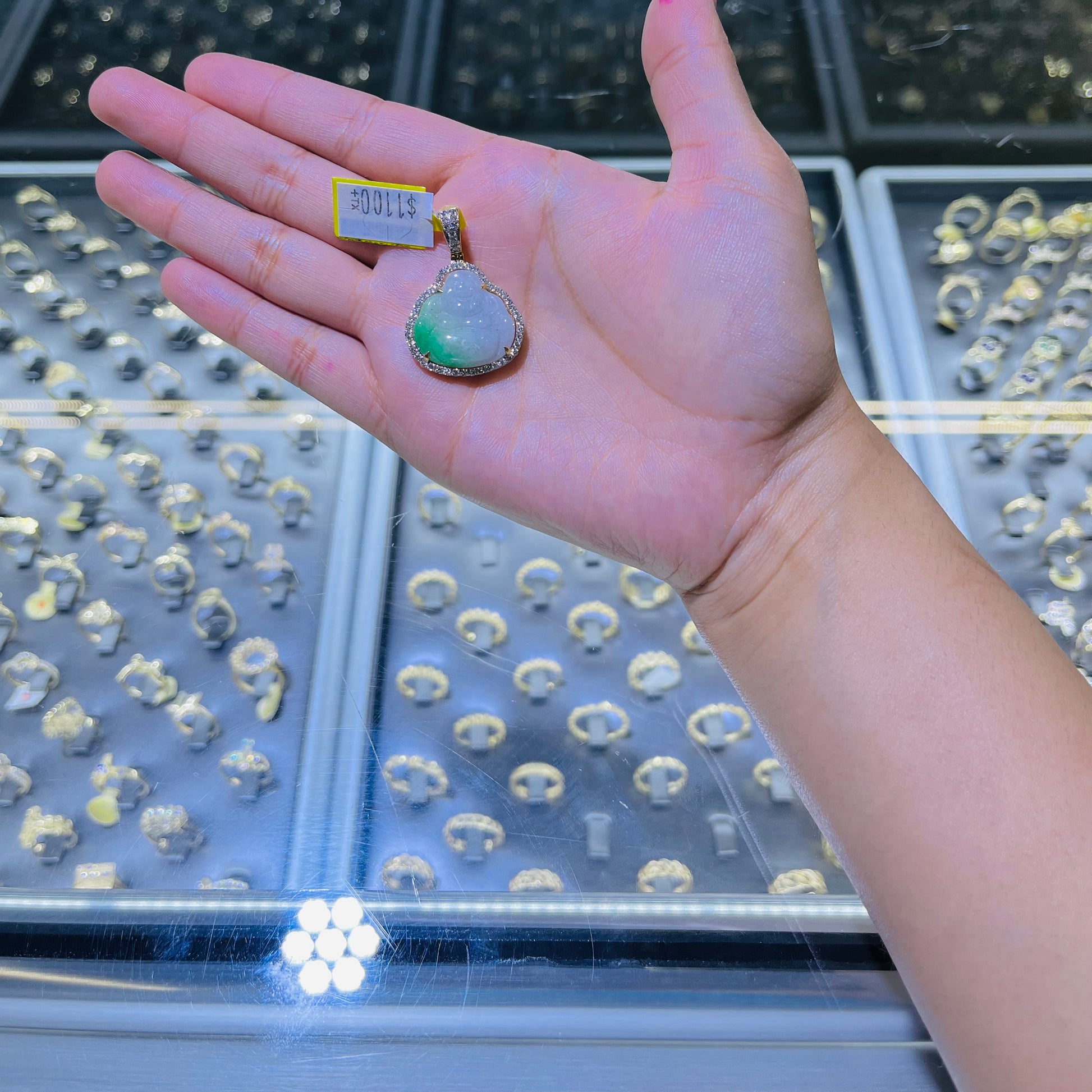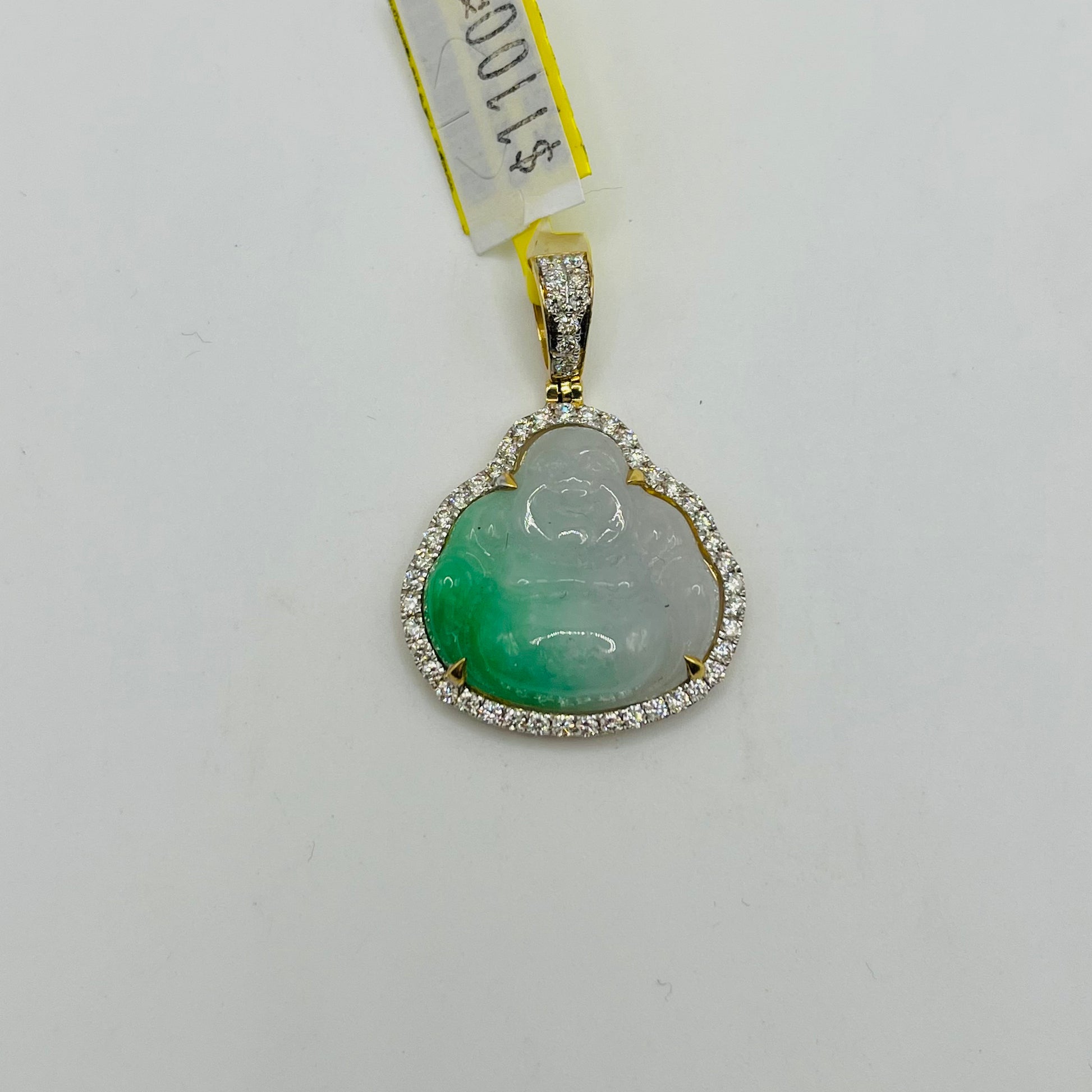 10k Gold Natural Diamond Green And White Jade Buddha Charm