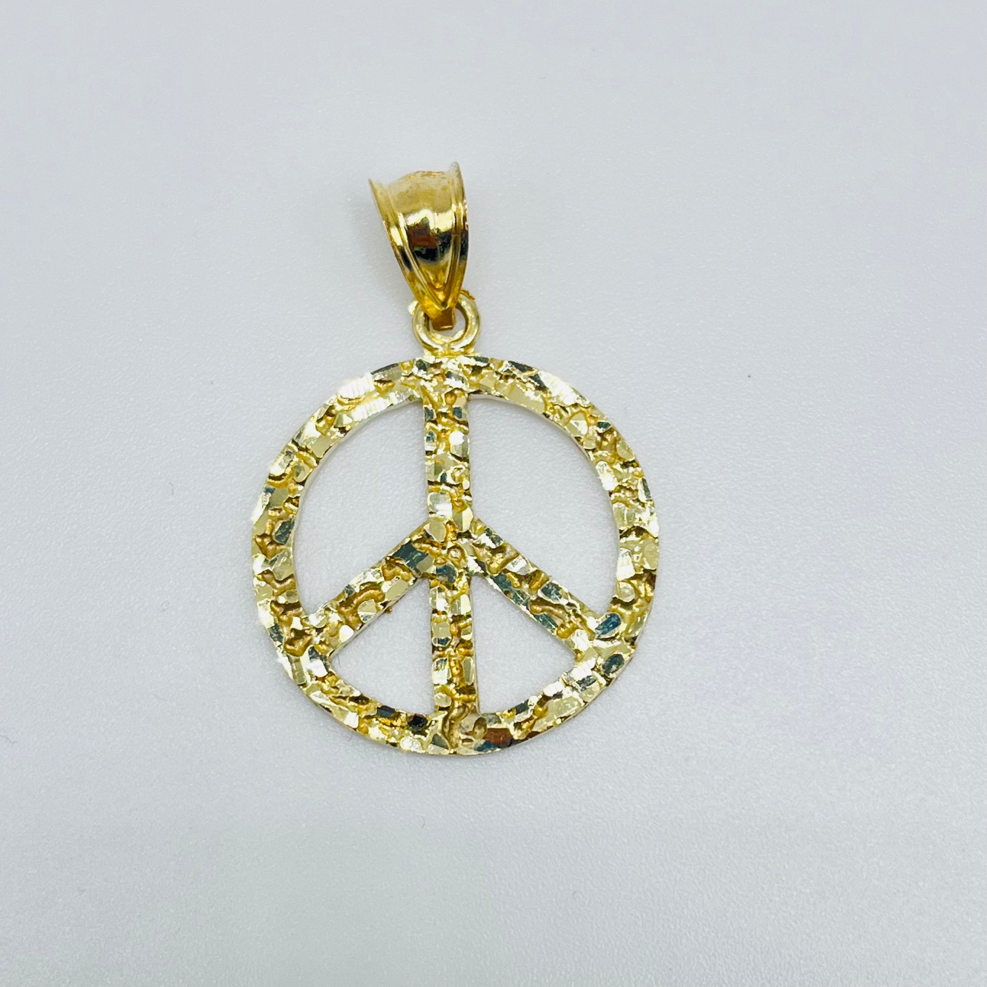 This 10K gold nugget peace charm combines a textured nugget design with the iconic peace symbol. Bold and stylish, it’s a unique accessory that adds character to any jewelry collection.