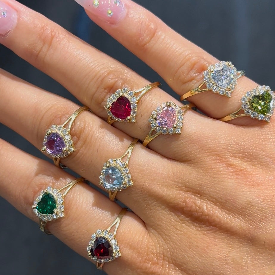 Express your individuality with our new birthstone rings. They feature a beautiful CZ Halo accent surrounding the heart shaped birthstone set in 10k gold.