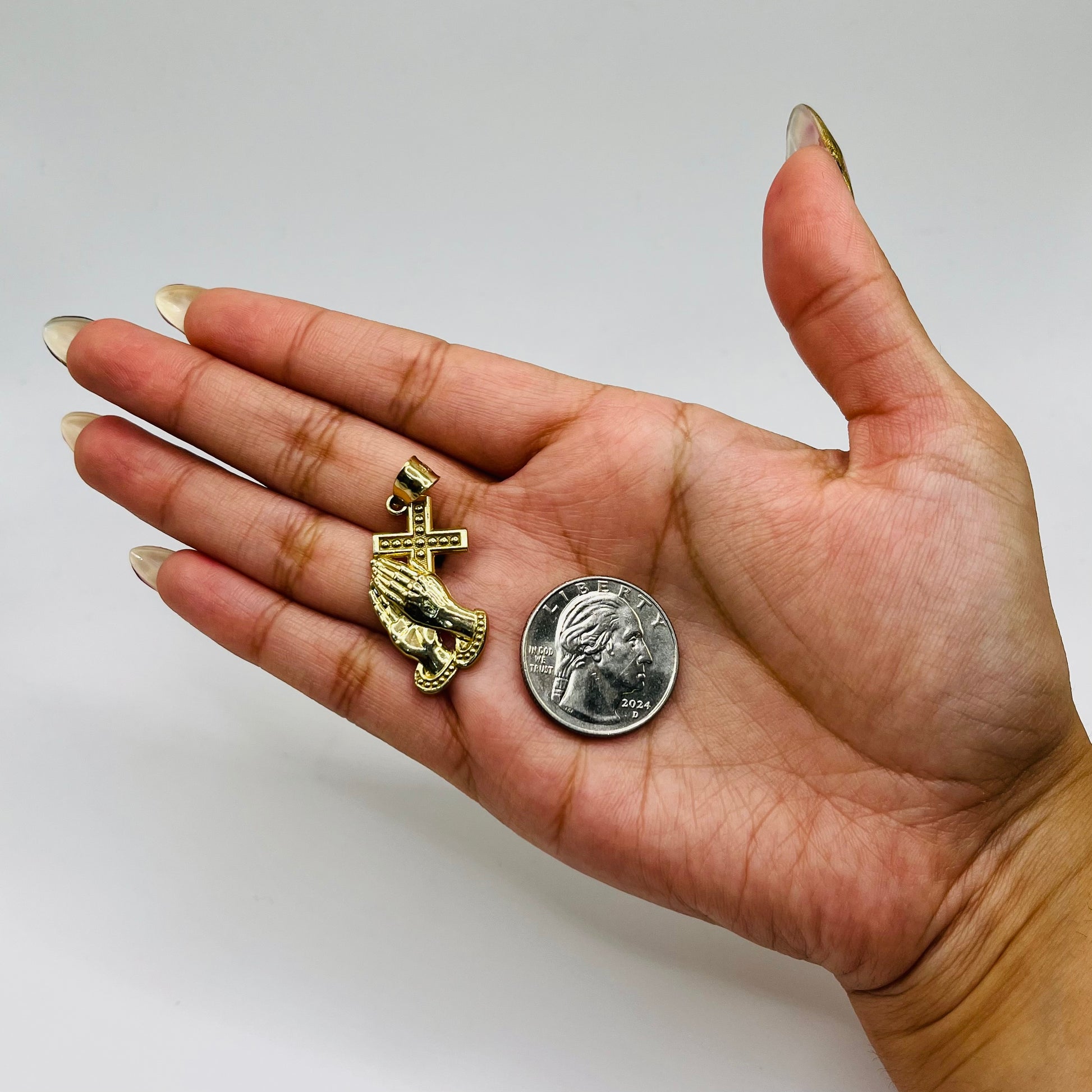 Elevate your faith and style with this 10k Gold Praying Hands with Cross Charm. Crafted with fine detail, this elegant piece symbolizes devotion and protection, making it a meaningful addition to any jewelry collection. Its timeless design pairs beautifully with any outfit, offering a subtle yet powerful expression of your beliefs. Perfect for daily wear or as a thoughtful gift, this charm brings both spiritual significance and lasting beauty.