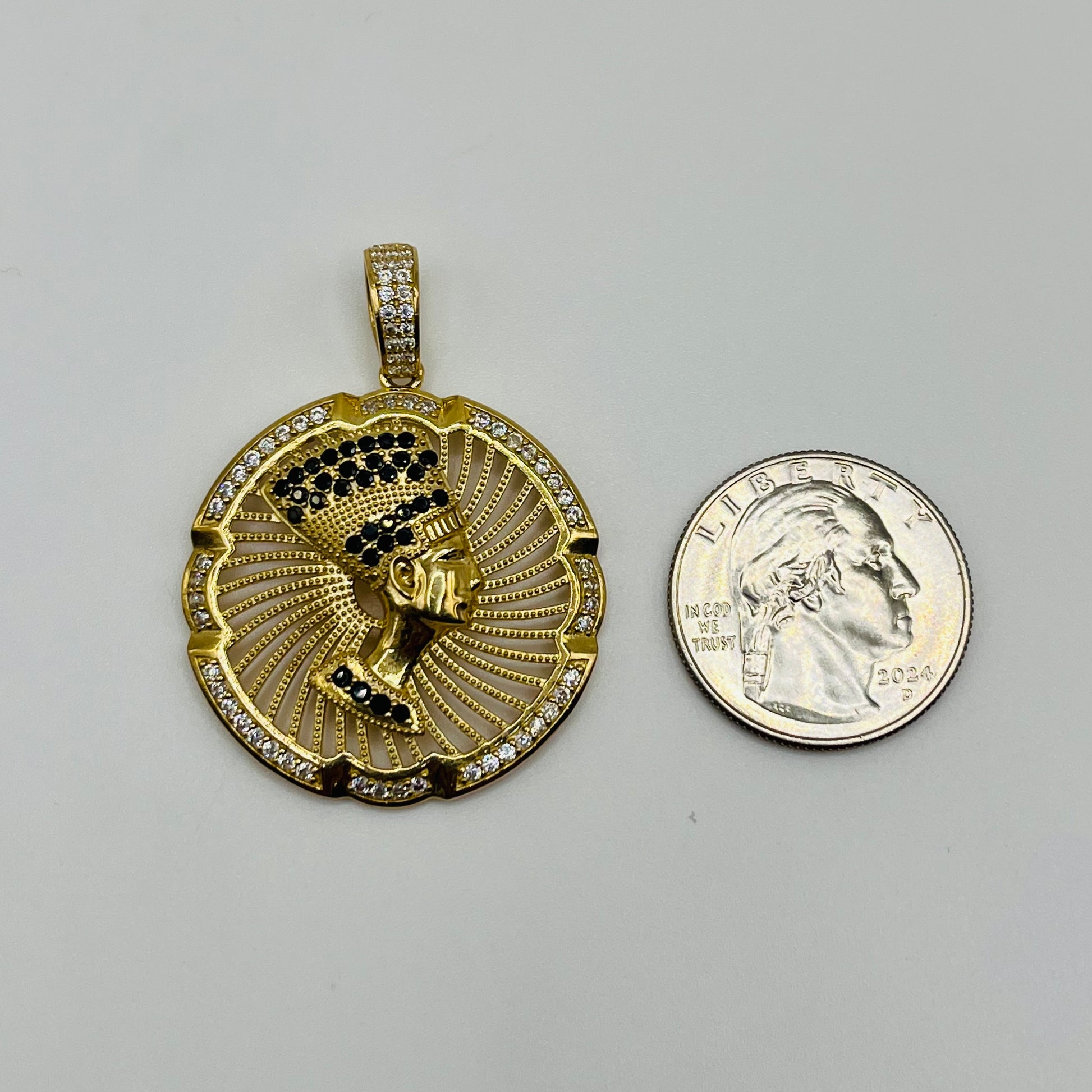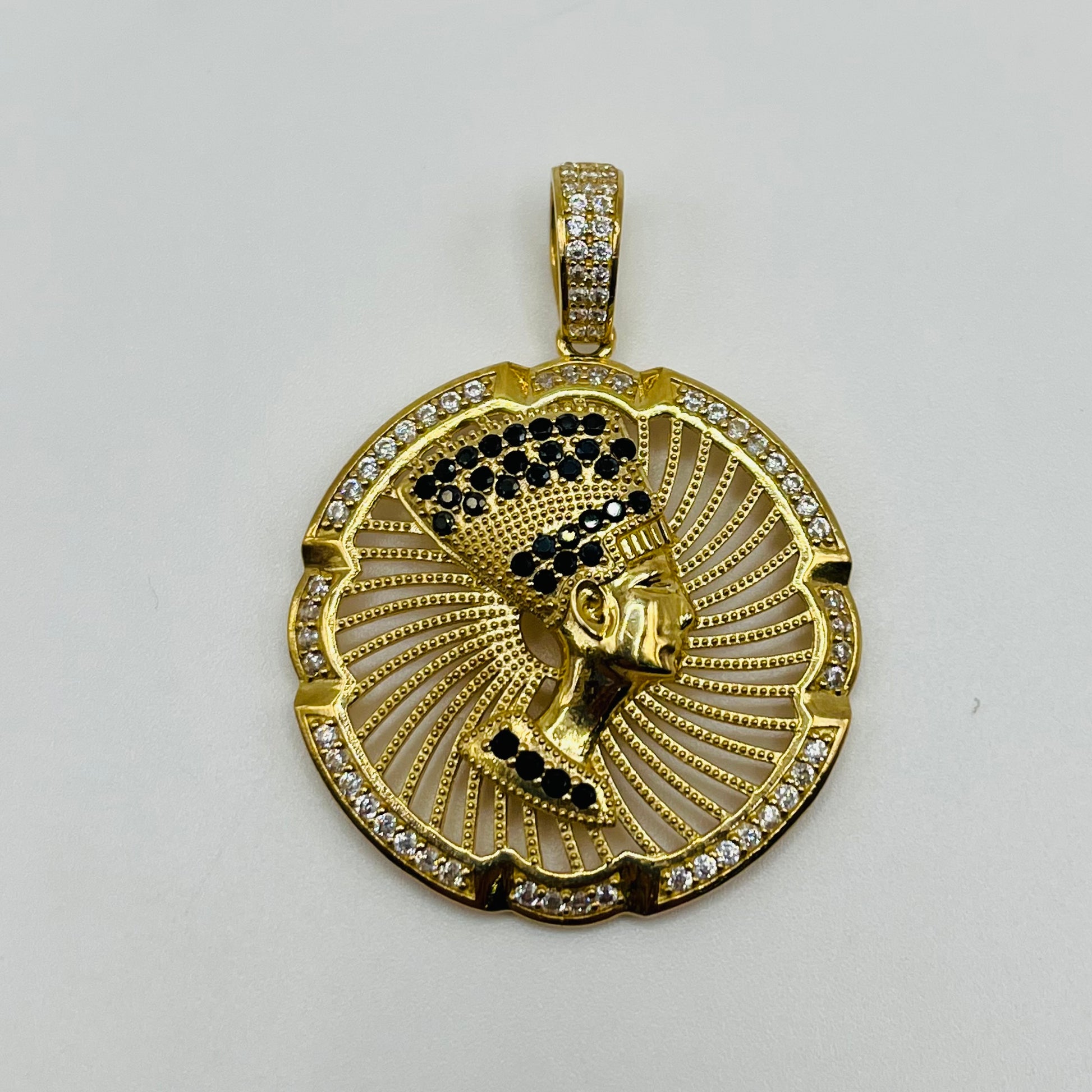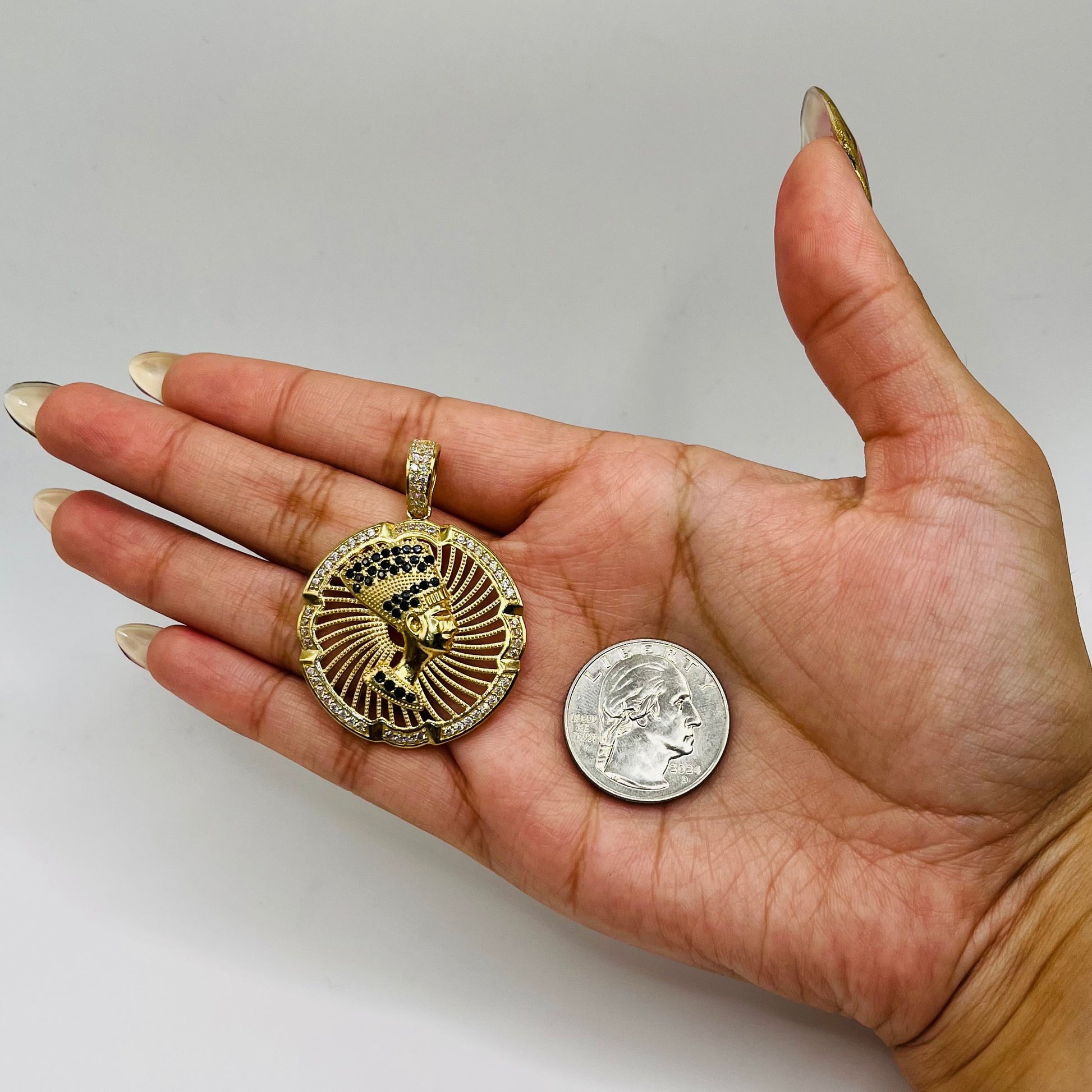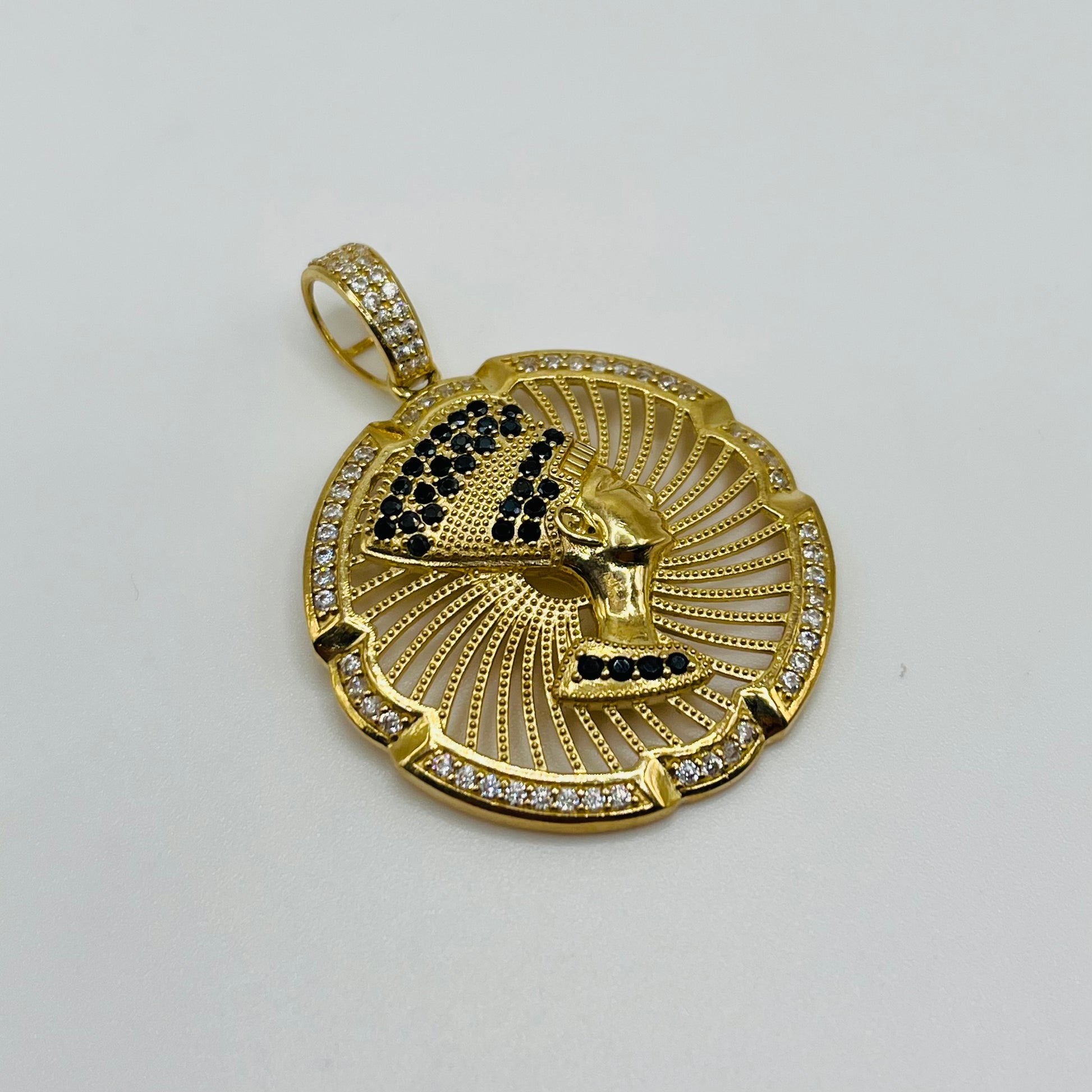 This 10k gold charm features a dazzling round cubic zirconia bezel that swirls gracefully, crowned by an elegant Nefertiti figure atop the design. Its unique blend of sparkling brilliance and timeless symbolism makes it a captivating accessory that adds both style and meaning to your jewelry collection. Perfect for those who appreciate artistry and history in one exquisite piece.