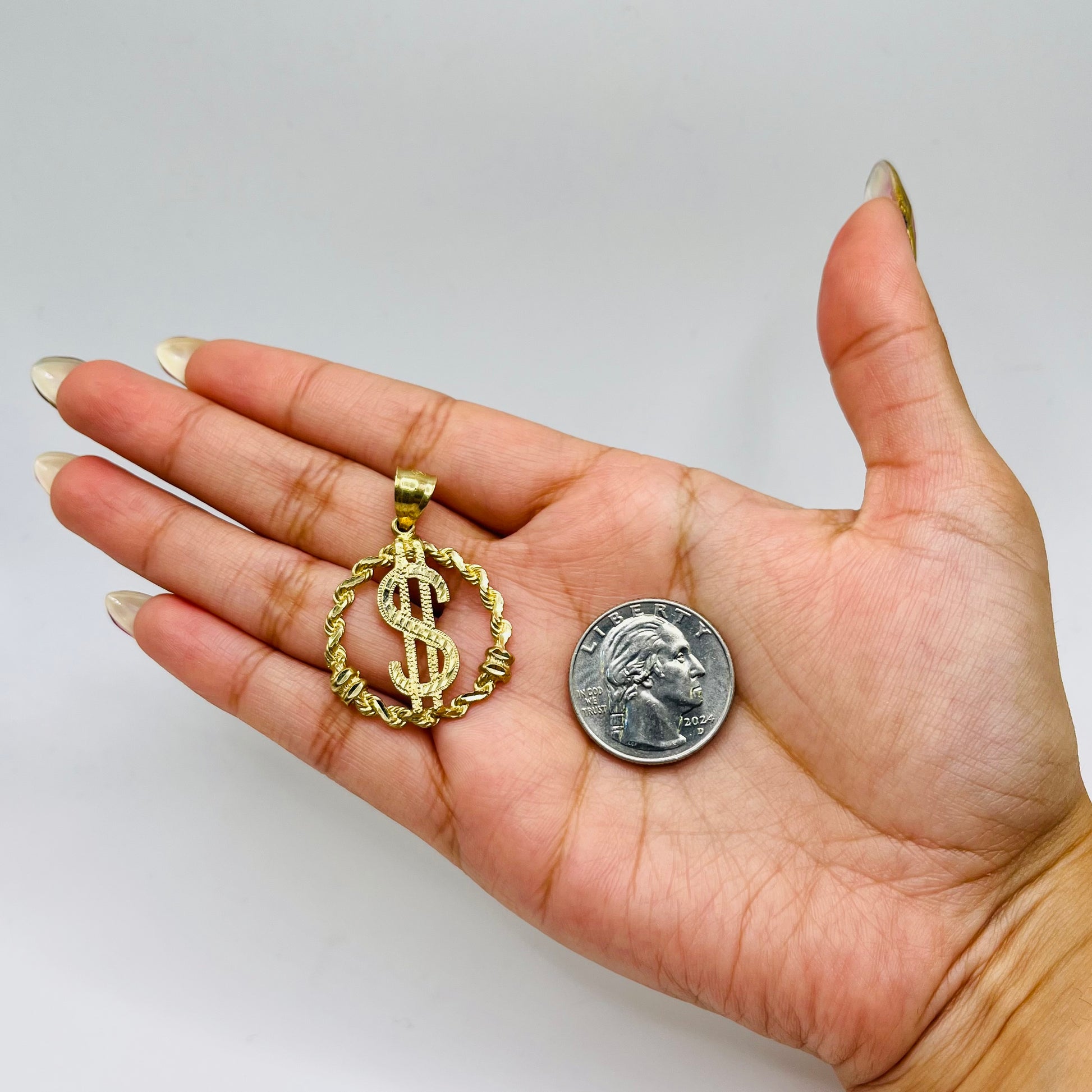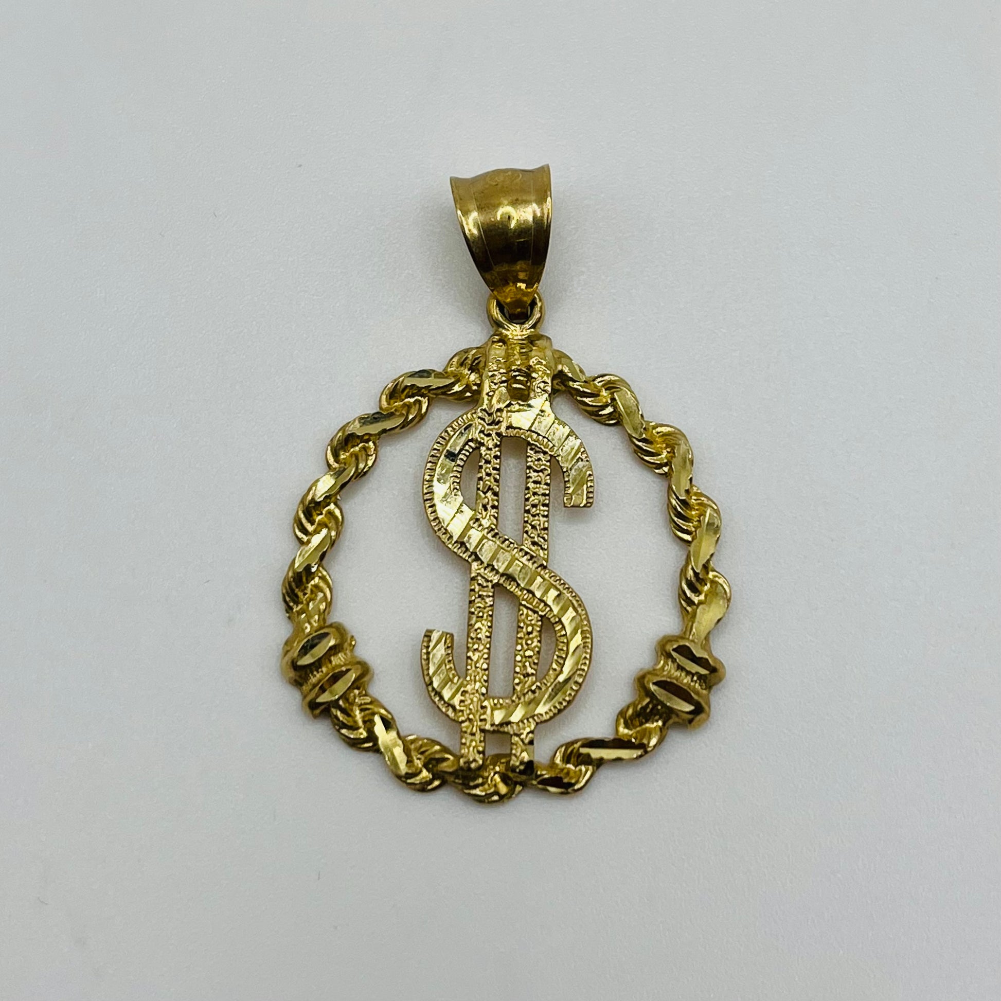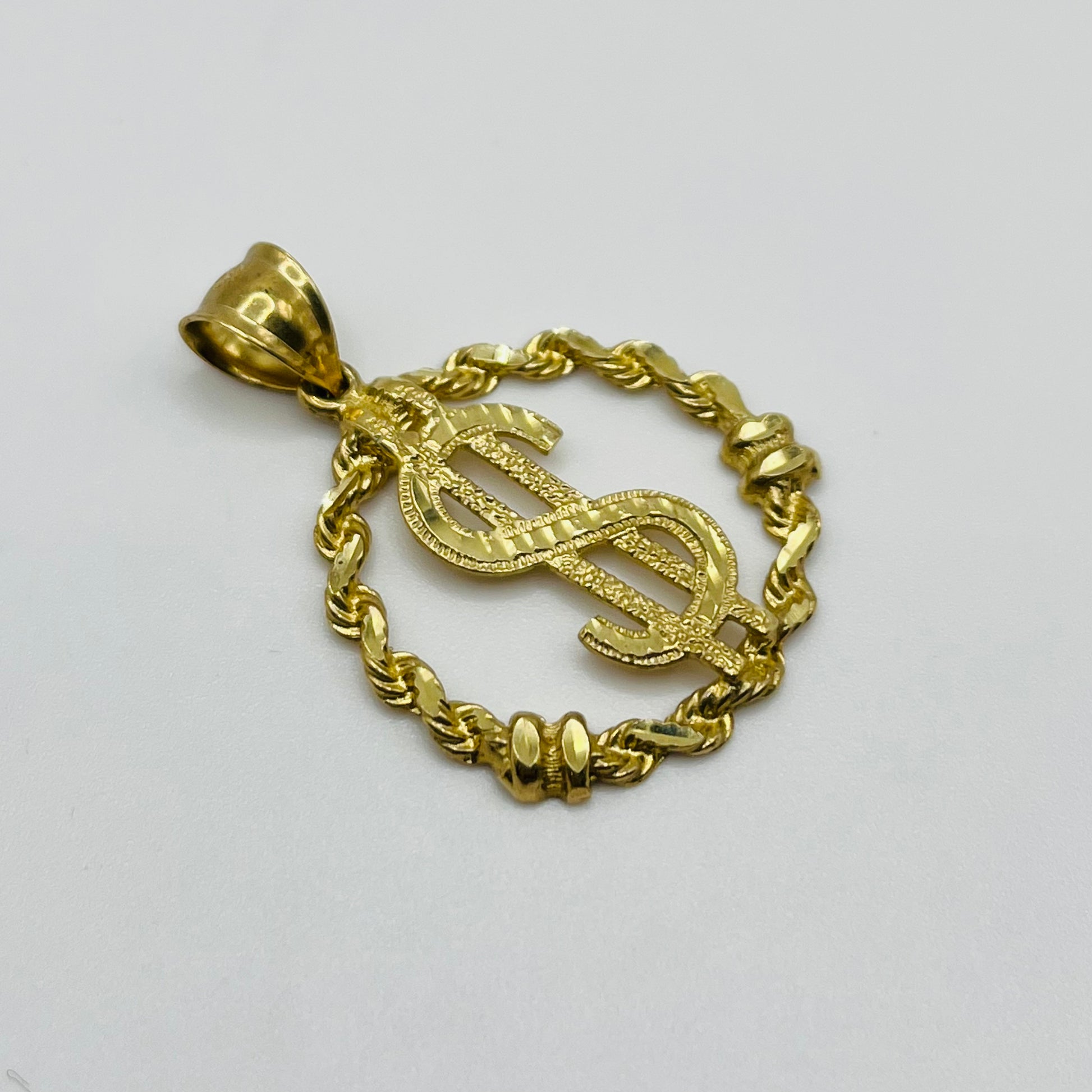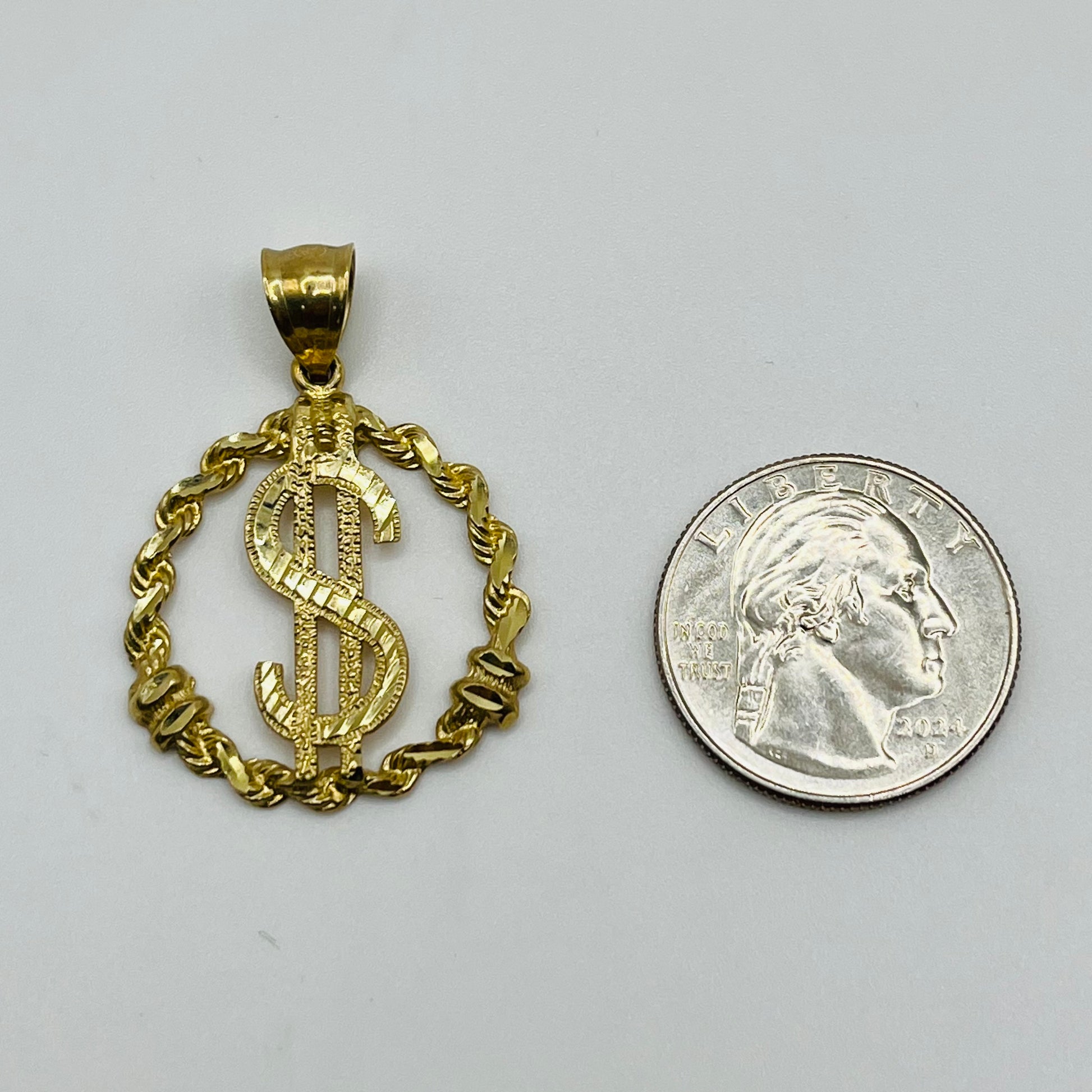 Elevate your style with this 10k Gold Round Rope Money-Sign Charm, featuring a sleek rope design encircling a bold money-sign centerpiece. Crafted from genuine 10k gold, this charm adds a touch of luxury and symbolism to any necklace or bracelet, perfect for those who value success and prosperity. Its timeless design makes it a versatile accessory for everyday wear or special occasions. Make a statement that shines with this elegant and meaningful charm.