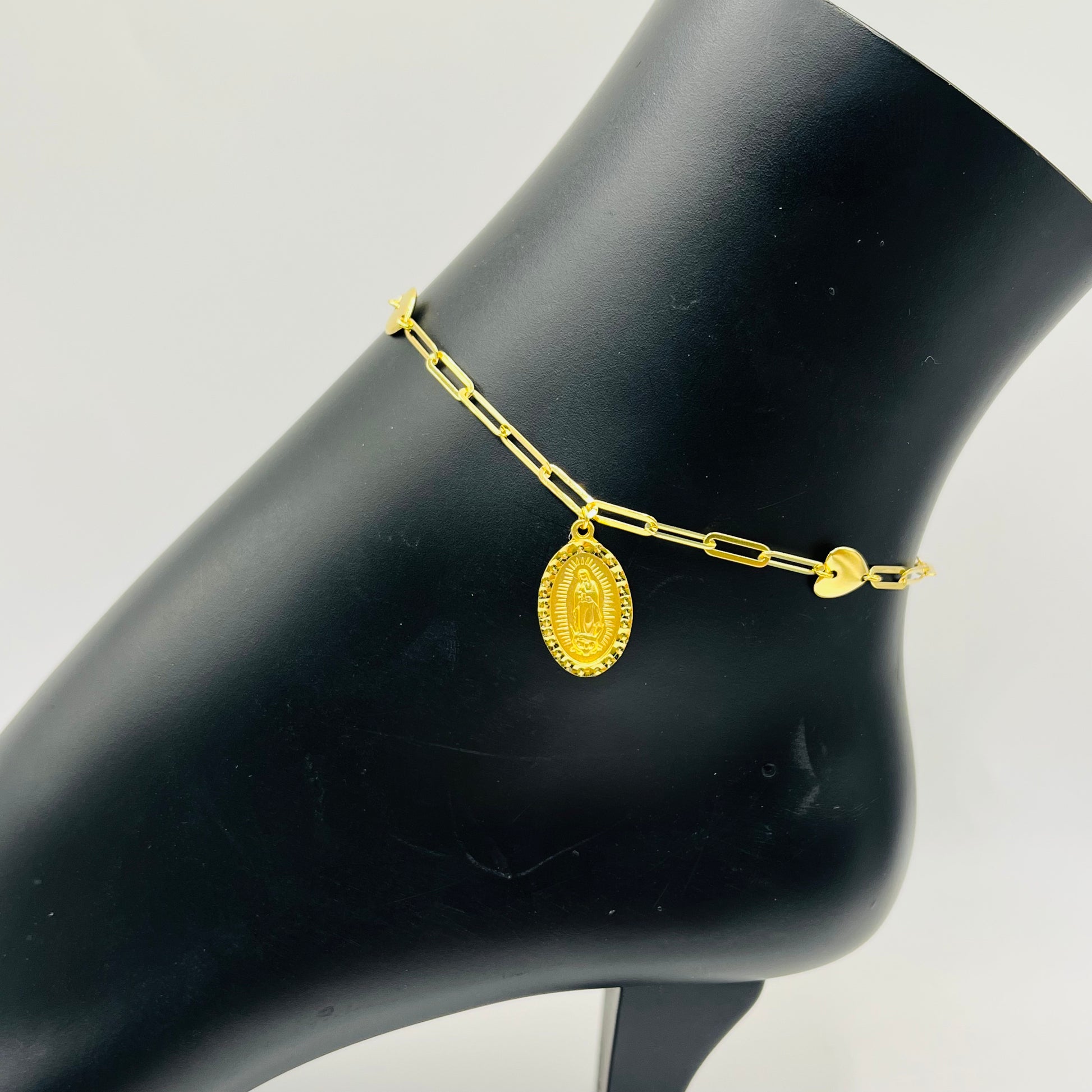 Elevate your style with this 10k Gold Single Virgin Mary Paperclip Anklet. Featuring a delicate paperclip chain adorned with charming heart details and a single round Virgin Mary charm, this anklet blends meaningful symbolism with elegant design. Perfect for daily wear or special occasions, it adds a subtle touch of grace and sophistication to any outfit. Crafted in 10k gold, it ensures lasting quality and a radiant shine that complements your unique look.