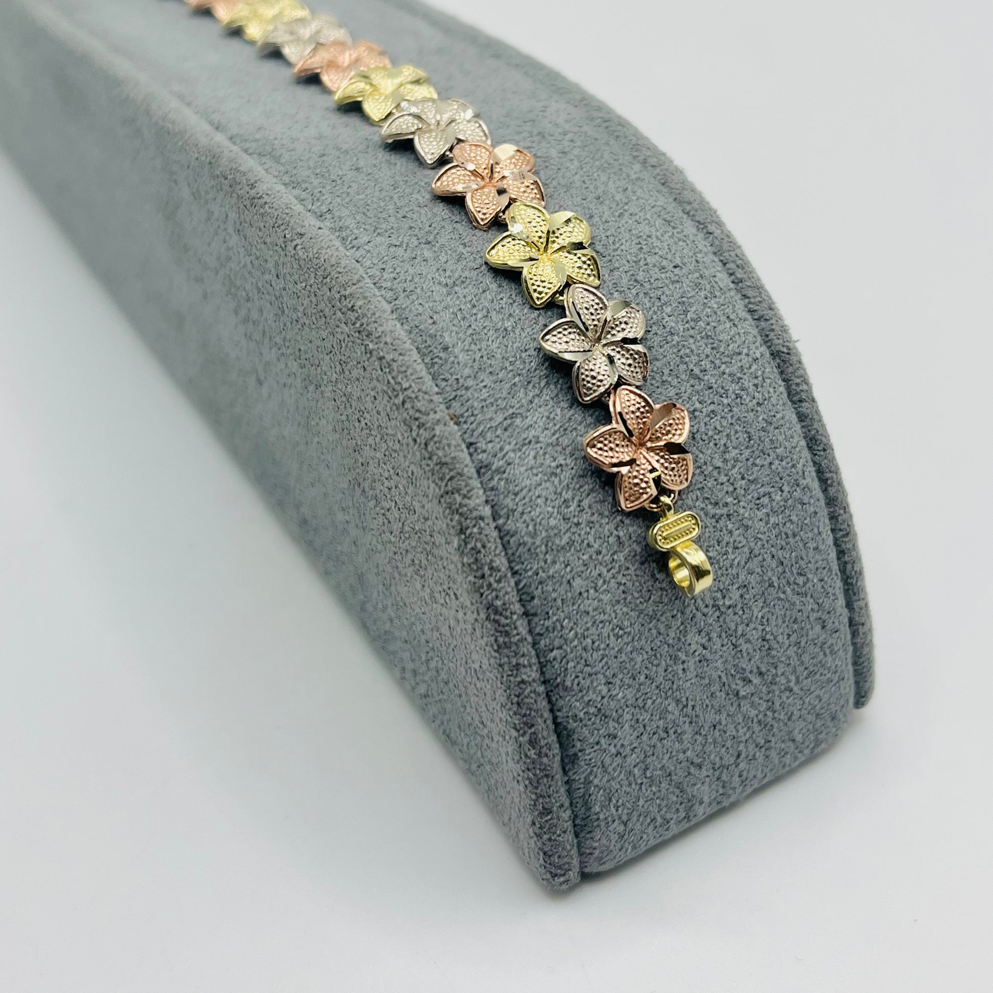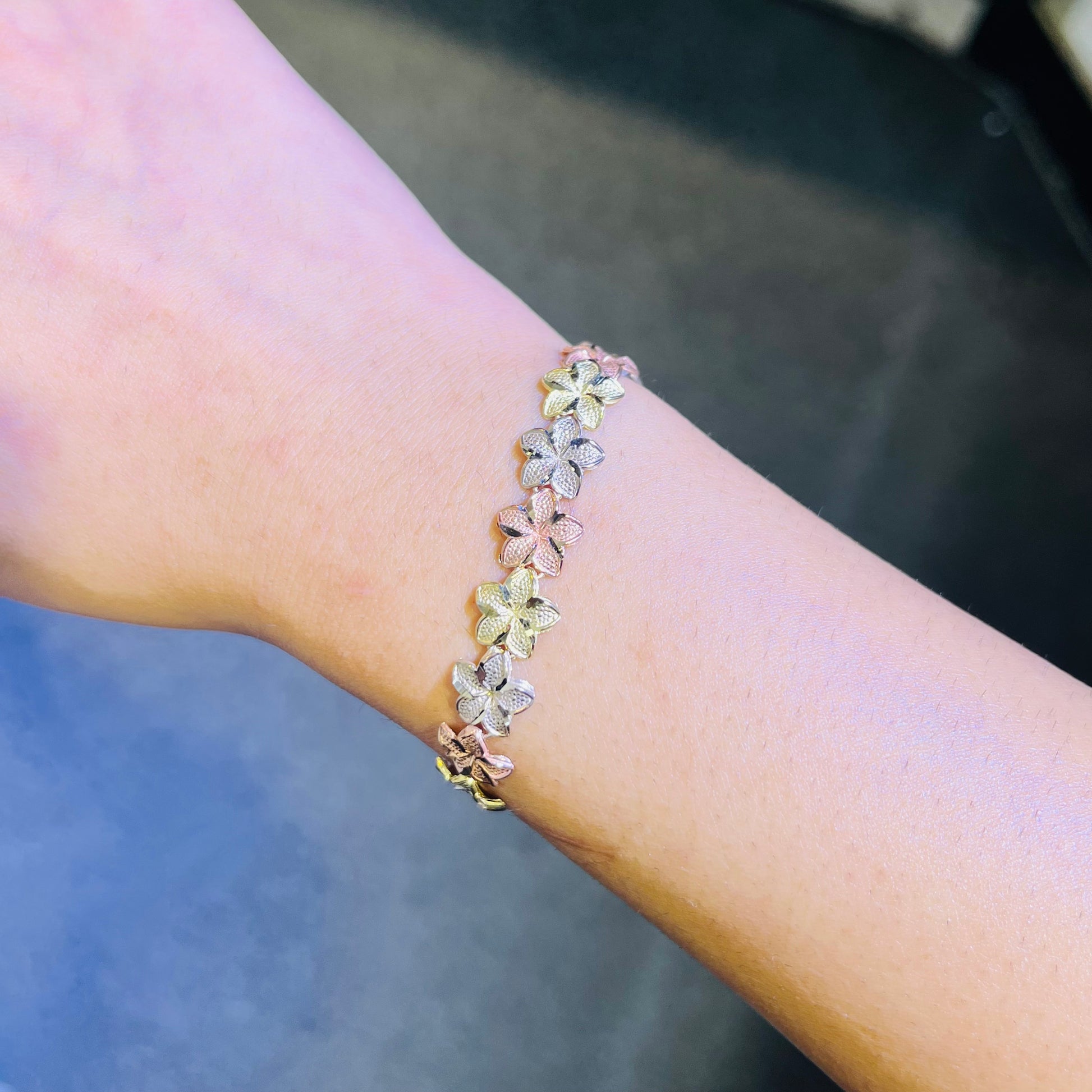 Enhance your everyday style with our limited edition 10k Gold Tri-Color Hibiscus Bracelet. This stunning piece features a beautiful hibiscus design in three different shades, adding a touch of elegance to any outfit. Don't miss out on this unique and eye-catching accessory.