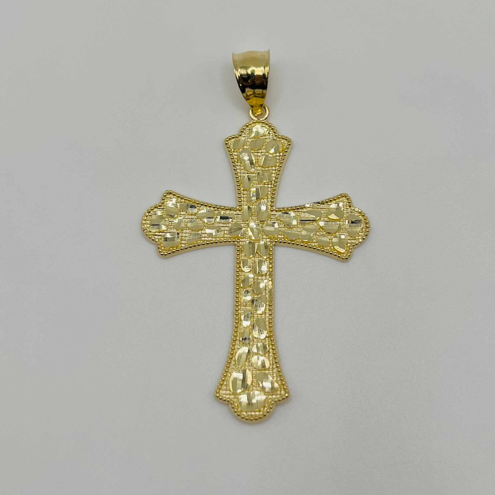 Elevate your style with the 10k Gold Sol Nugget Cross Pendant, featuring a unique nugget design that blends natural texture with classic elegance. Crafted in medium size, this pendant offers a distinctive statement while maintaining versatile wearability. Perfect for daily wear or special occasions, it adds a touch of refined sophistication to any outfit.