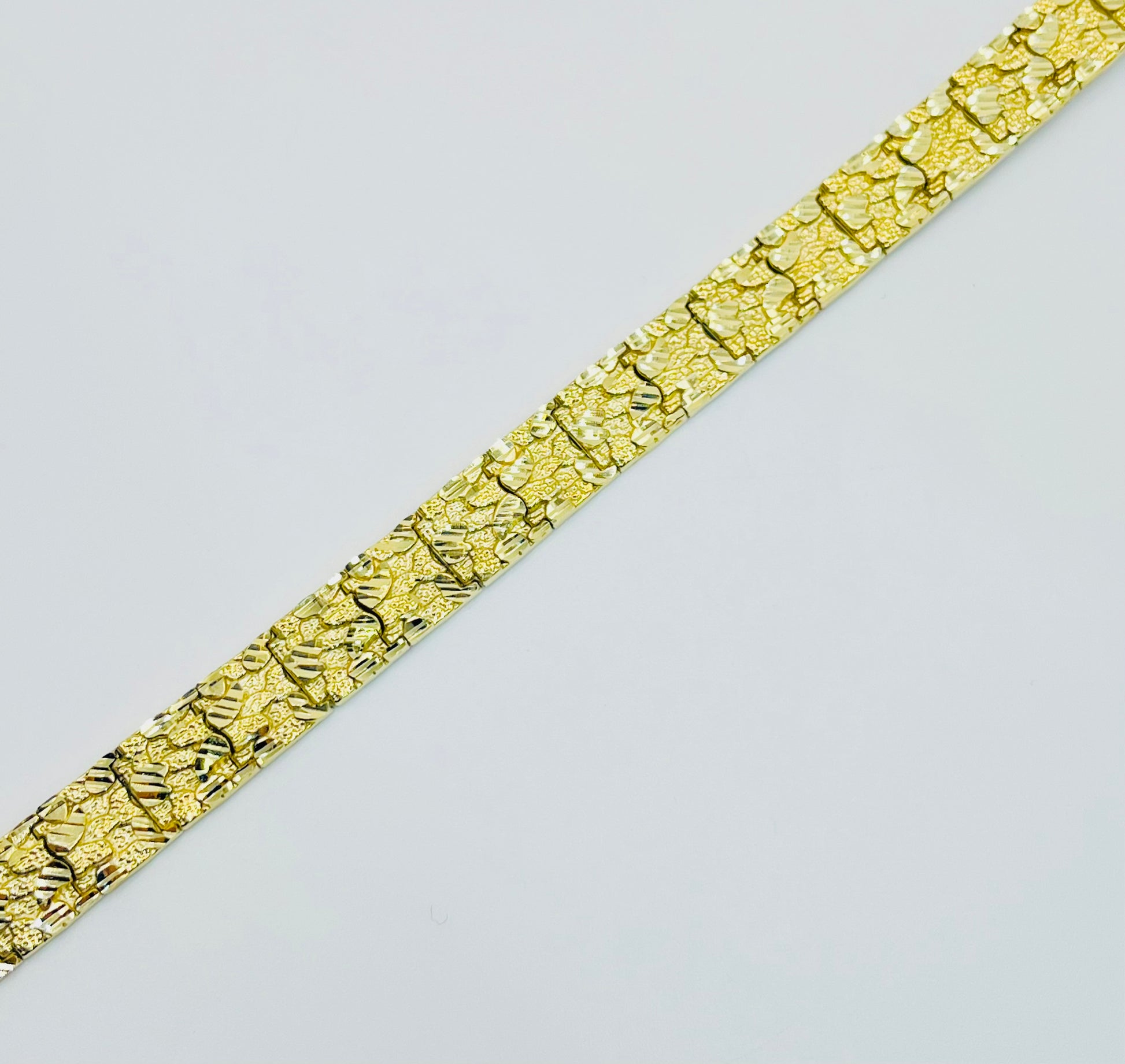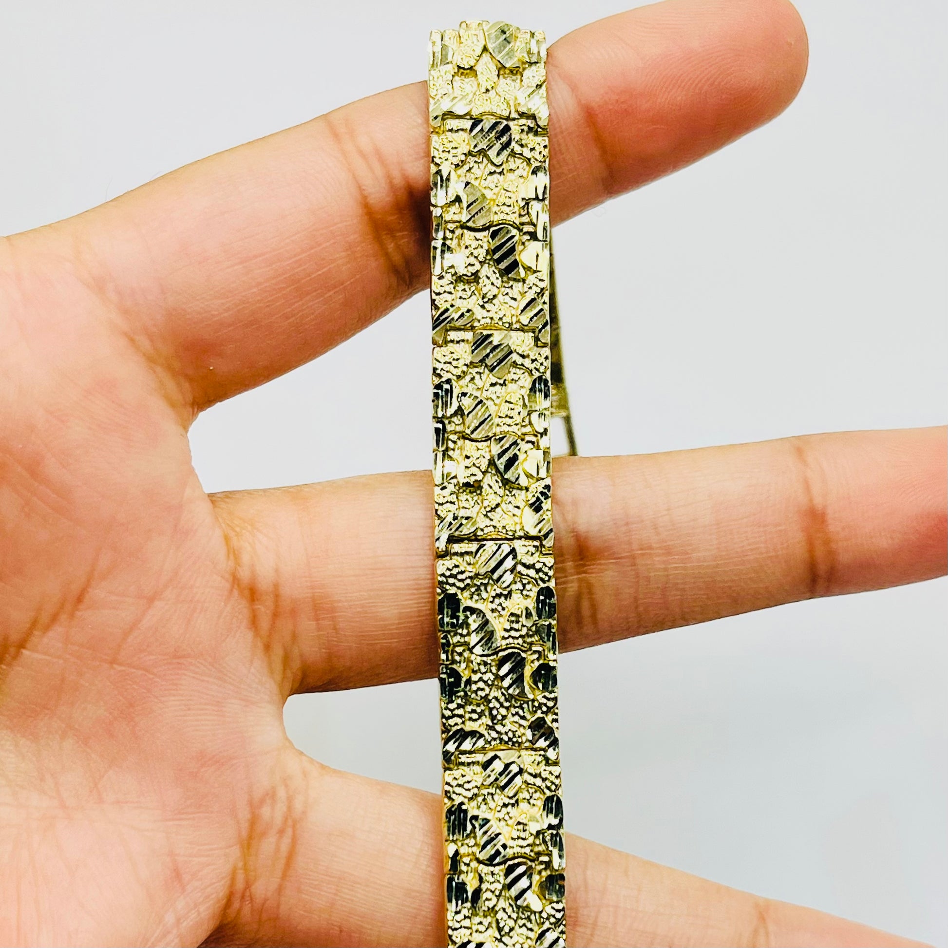 Upgrade your wrist game with our 10K Gold solid 10mm nugget bracelet – a sleek fusion of style and substance. Crafted for urban vibes, this statement piece effortlessly blends street chic with refined elegance, making it the perfect accessory for those who dare to stand out.