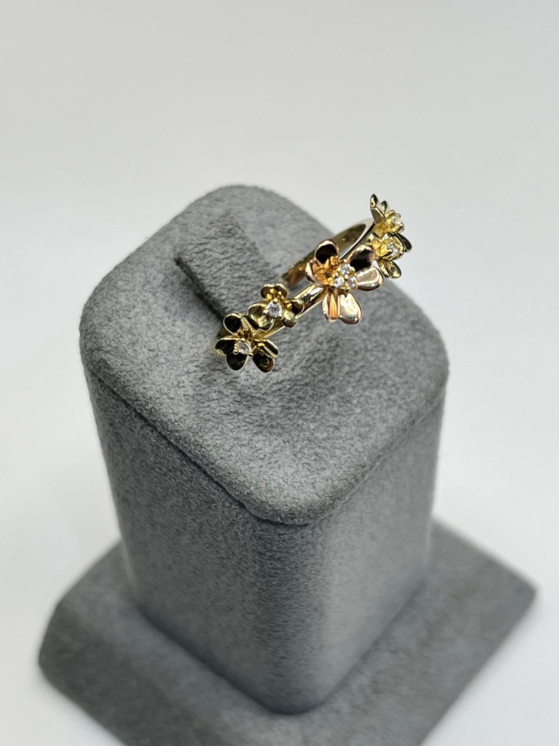 Delight in the delicate charm of this 10K Gold Tri Color Flower CZ Ring. Featuring an intricate floral design, each bloom is accented with a sparkling cubic zirconia center, adding a touch of brilliance to its radiant gold finish