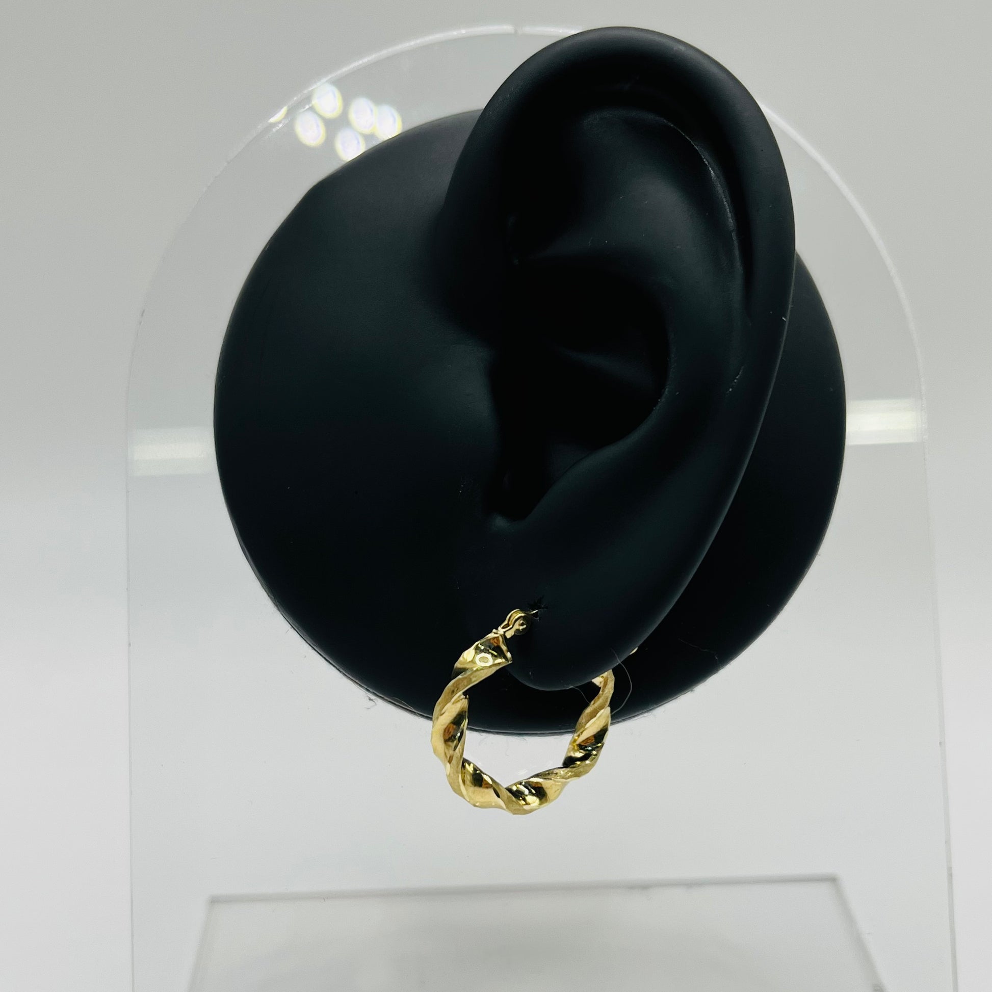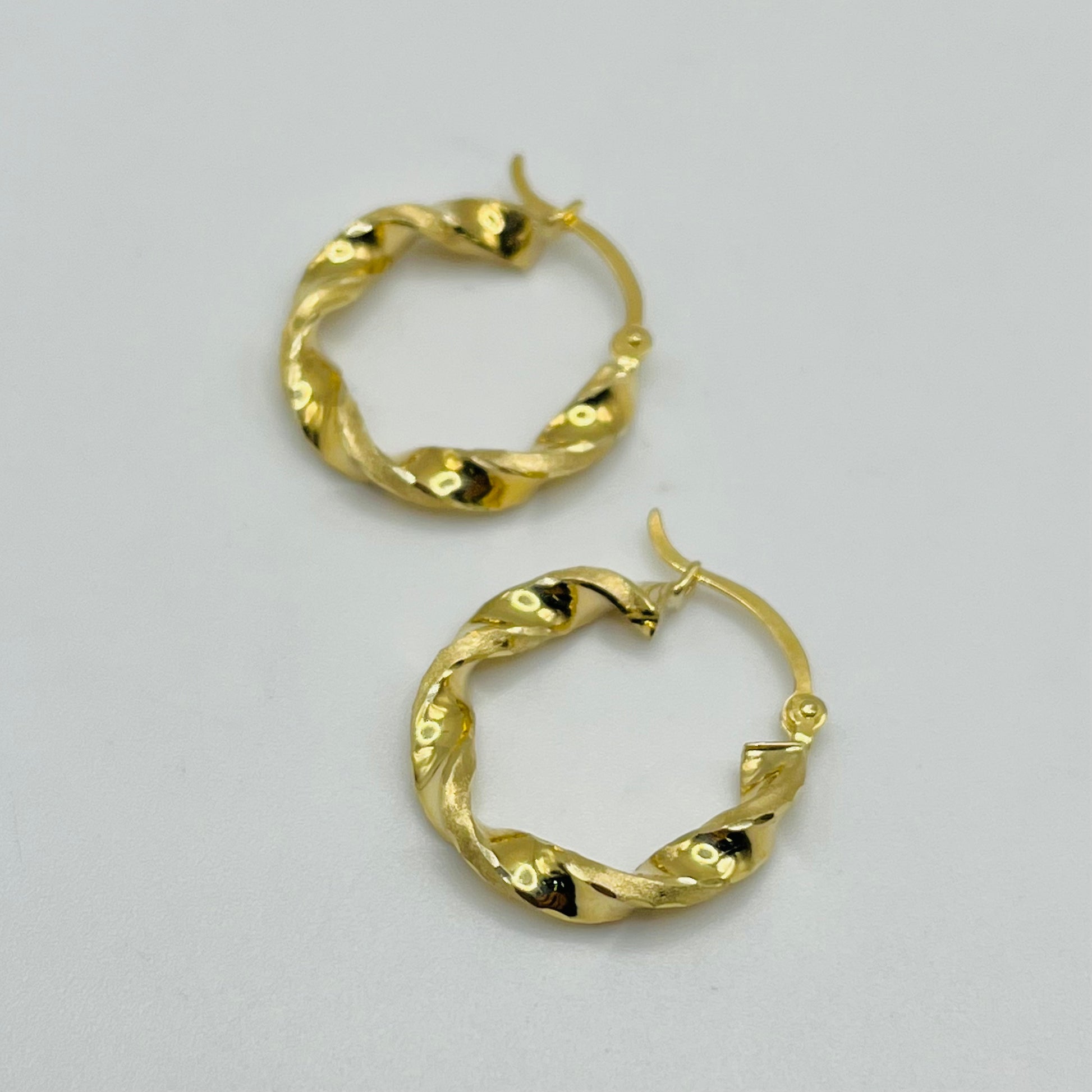 Elevate your style with these 10k Gold Twist Matte Hoops, measuring a perfect .75 inches. Their unique twisted design combines a sophisticated matte finish with subtle high polish accents, creating a striking contrast that catches the light beautifully. Lightweight and versatile, these hoops add a refined touch to any outfit, making them ideal for both everyday wear and special occasions. Experience timeless elegance with a modern twist.