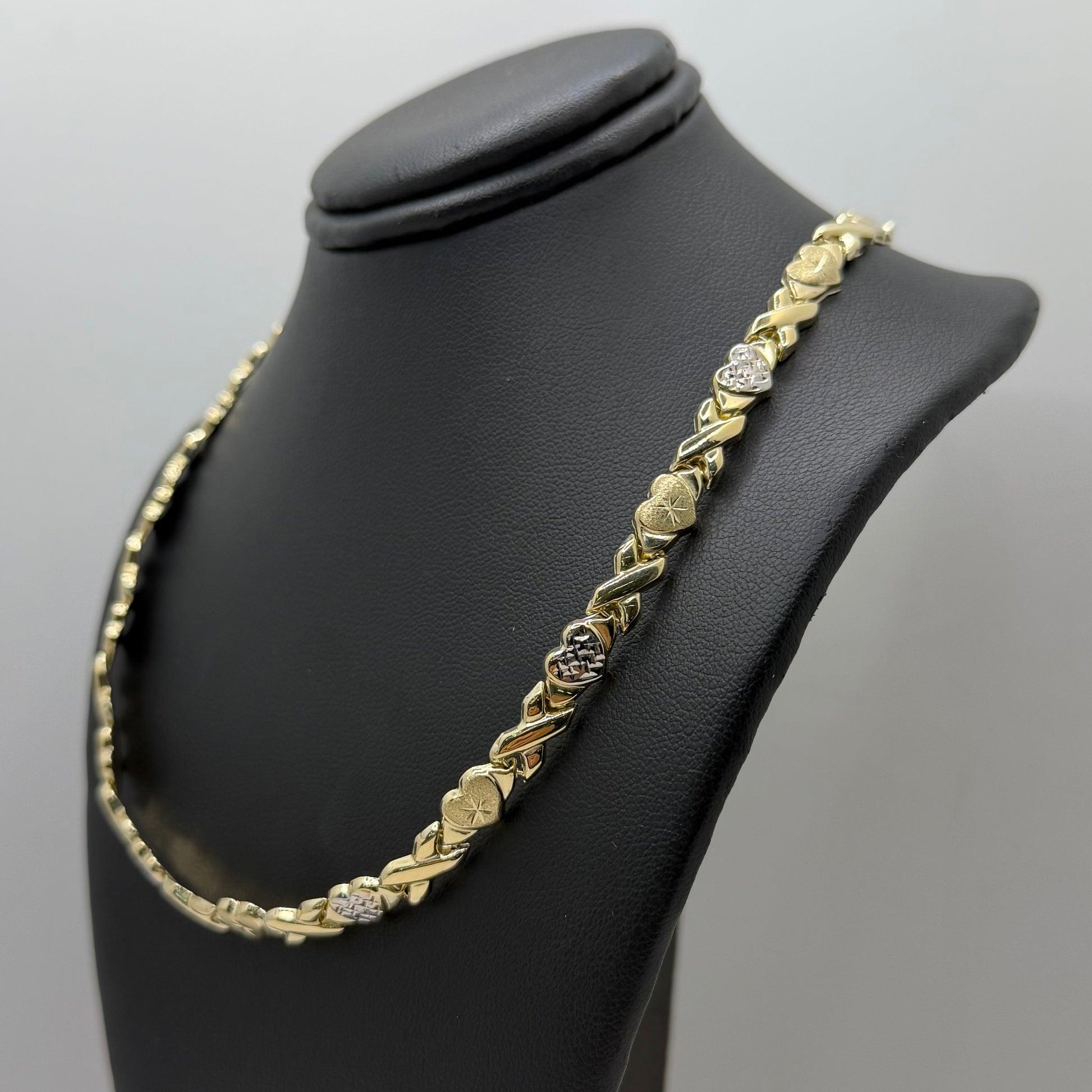 Elevate your jewelry collection with this stunning 10k gold two-tone XO chain. Crafted in a harmonious blend of white and yellow gold, this piece features an intricate pattern of interlocking X and O links that create a timeless, romantic aesthetic. The alternating metal tones add visual depth and versatility, making it easy to pair with other jewelry pieces. Perfect as a standalone statement or layered with delicate chains, this durable gold chain offers both elegance and everyday wearability. An ideal gift for someone special or a treasured addition to your own jewelry box.