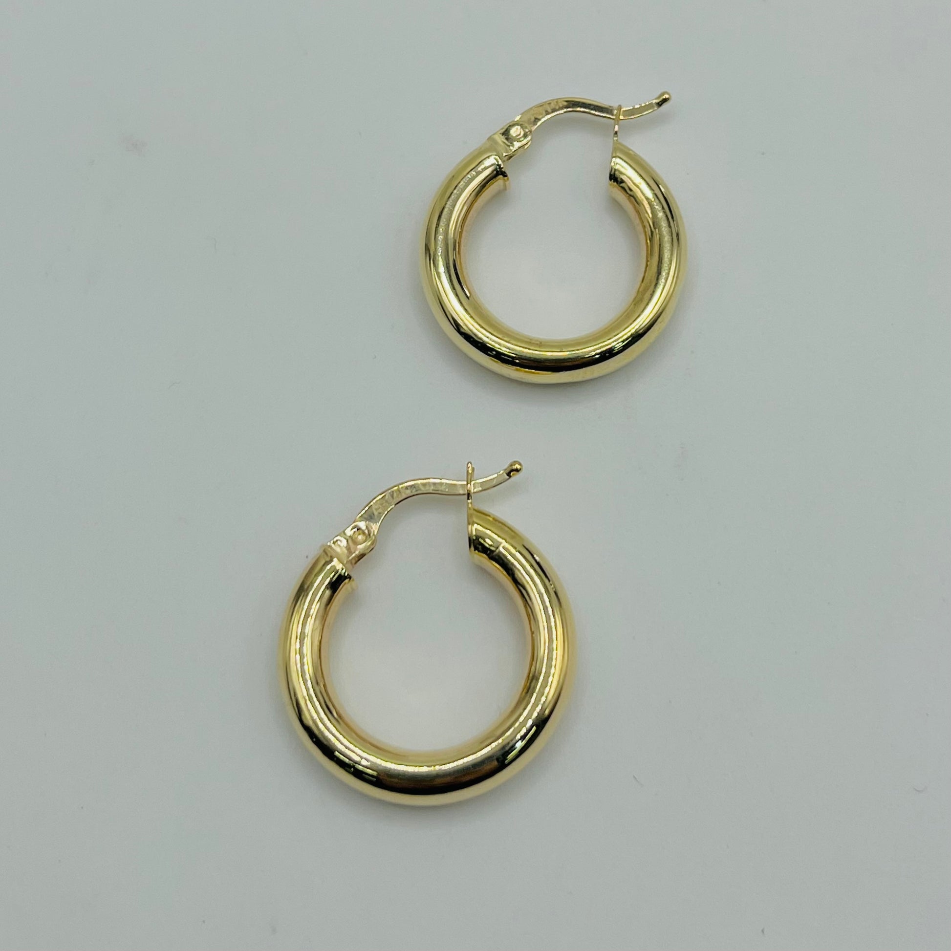 These elegant gold mini hoop earrings are the perfect accessory for adding a subtle touch of sophistication to any outfit. Crafted from high-quality 14K gold, they feature a sleek, polished finish that catches the light beautifully. These hoops are 15mm in diameter and 3mm thick.