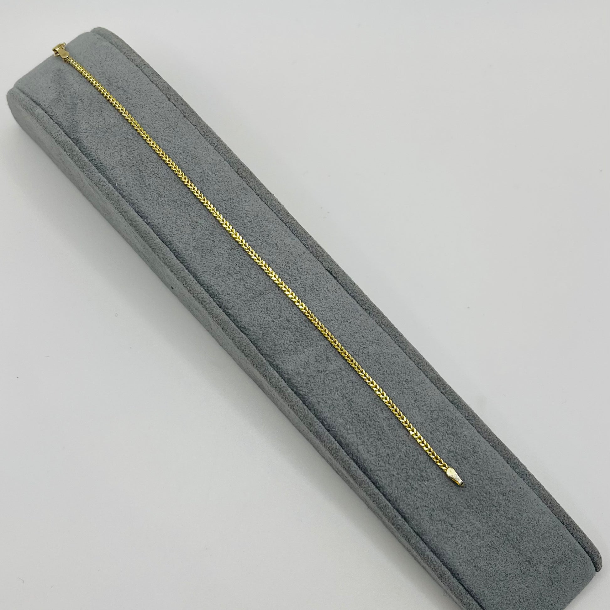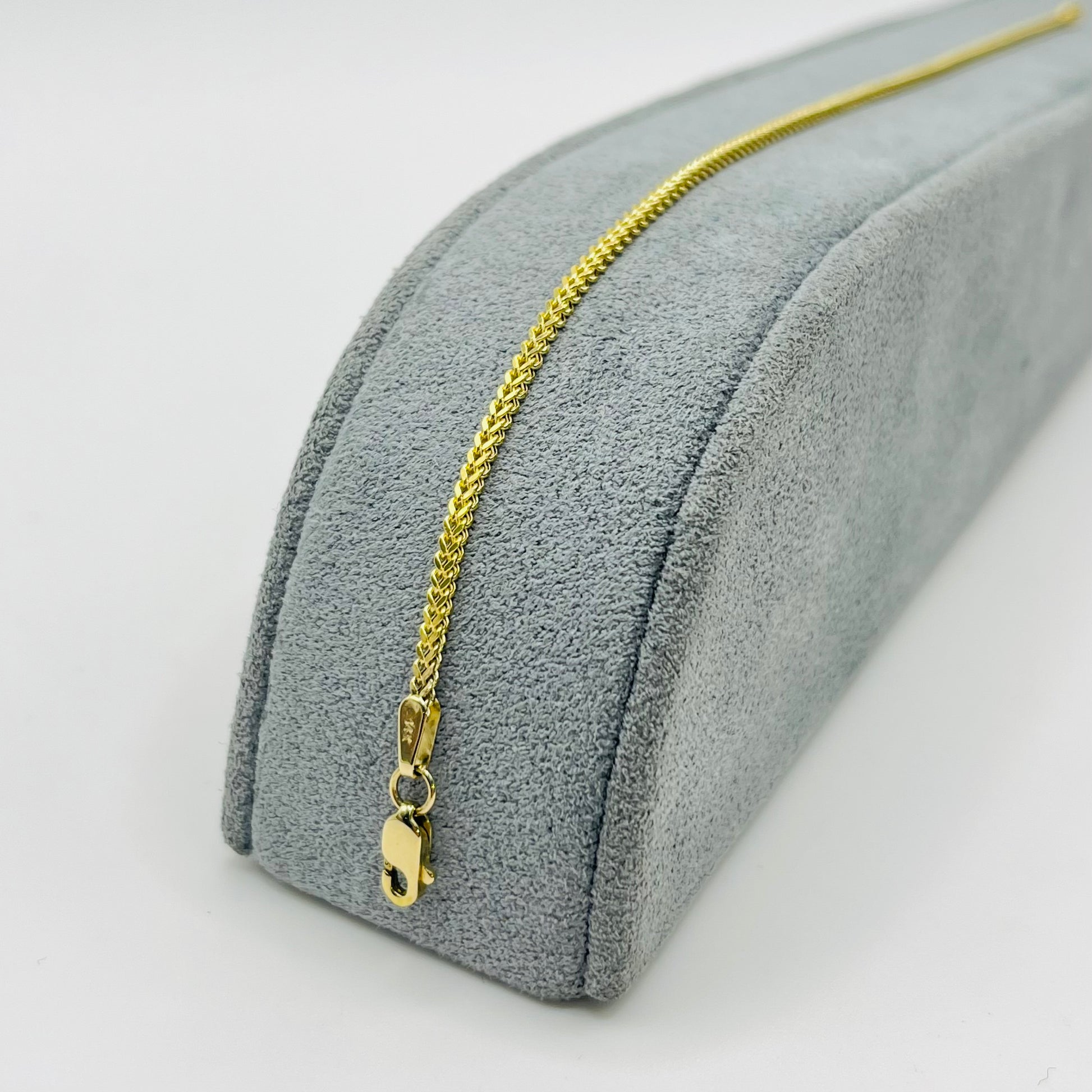 Elevate your everyday style with this 14k Gold 1.6mm Franco Bracelet. Its tightly woven design offers both durability and elegance, making it perfect for layering or wearing alone. Crafted from genuine 14k gold, this bracelet adds a subtle yet sophisticated shine to any outfit. Ideal for those seeking a timeless accessory that combines strength with refined beauty.