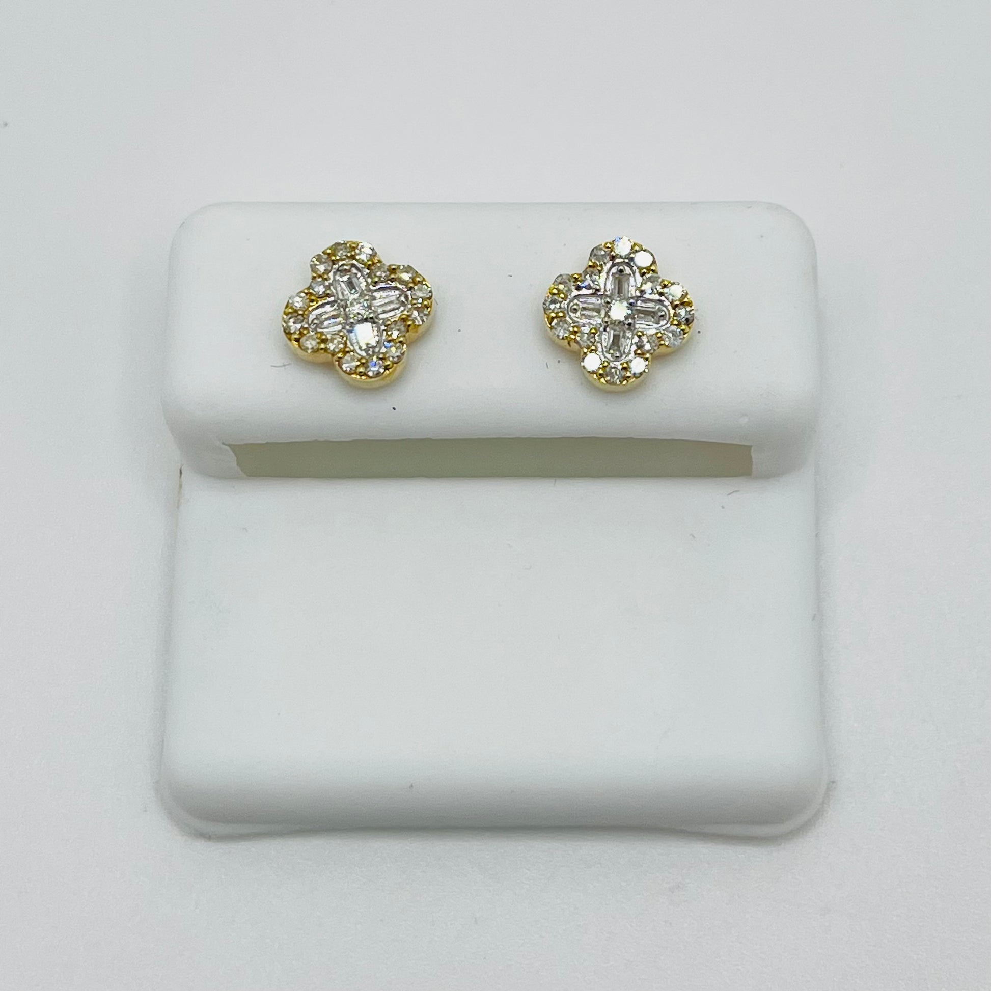 14k Gold Baguette Diamond Cross Clover Earrings 9mm