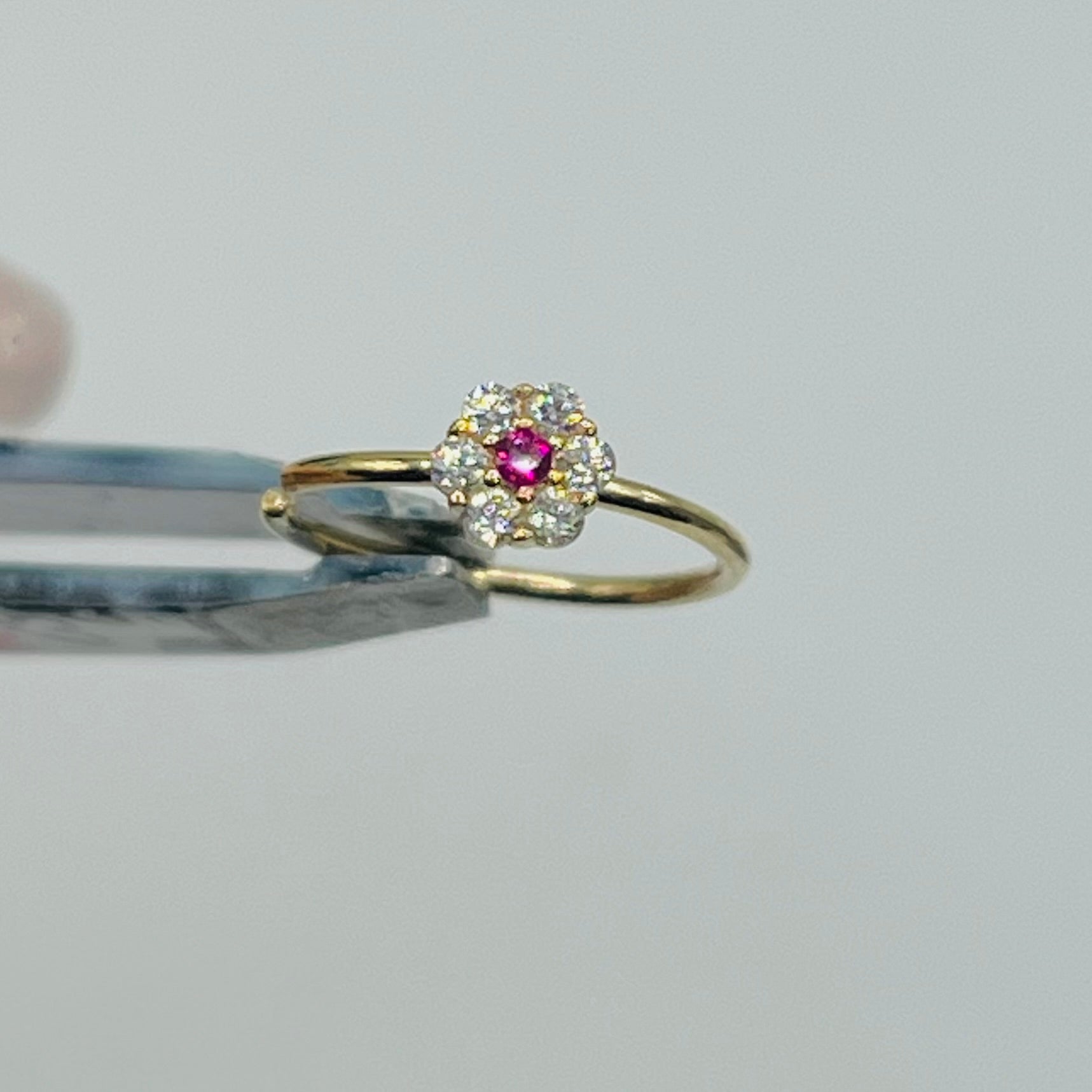 14K Gold CZ White Flower with Ruby Nose Ring Hoop
