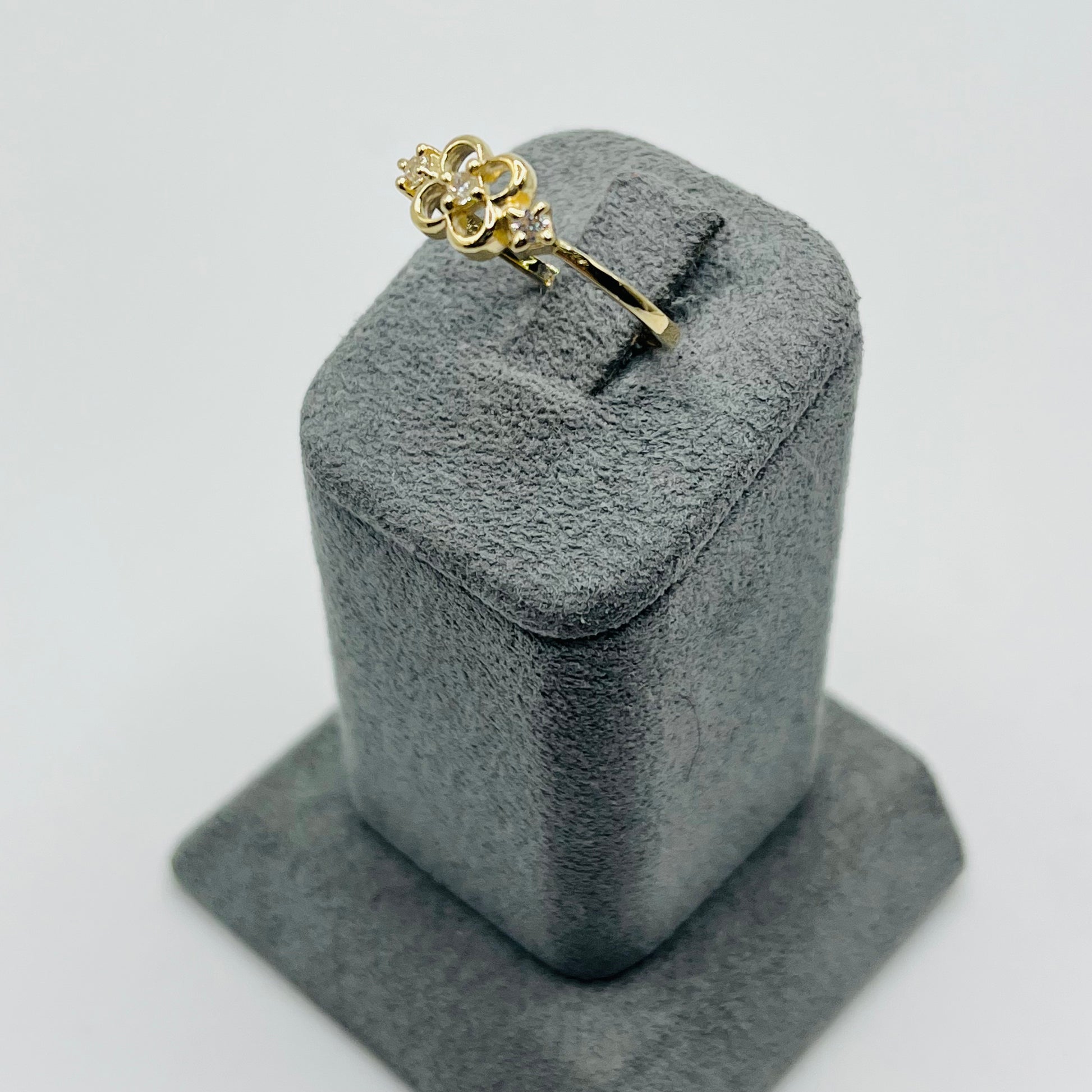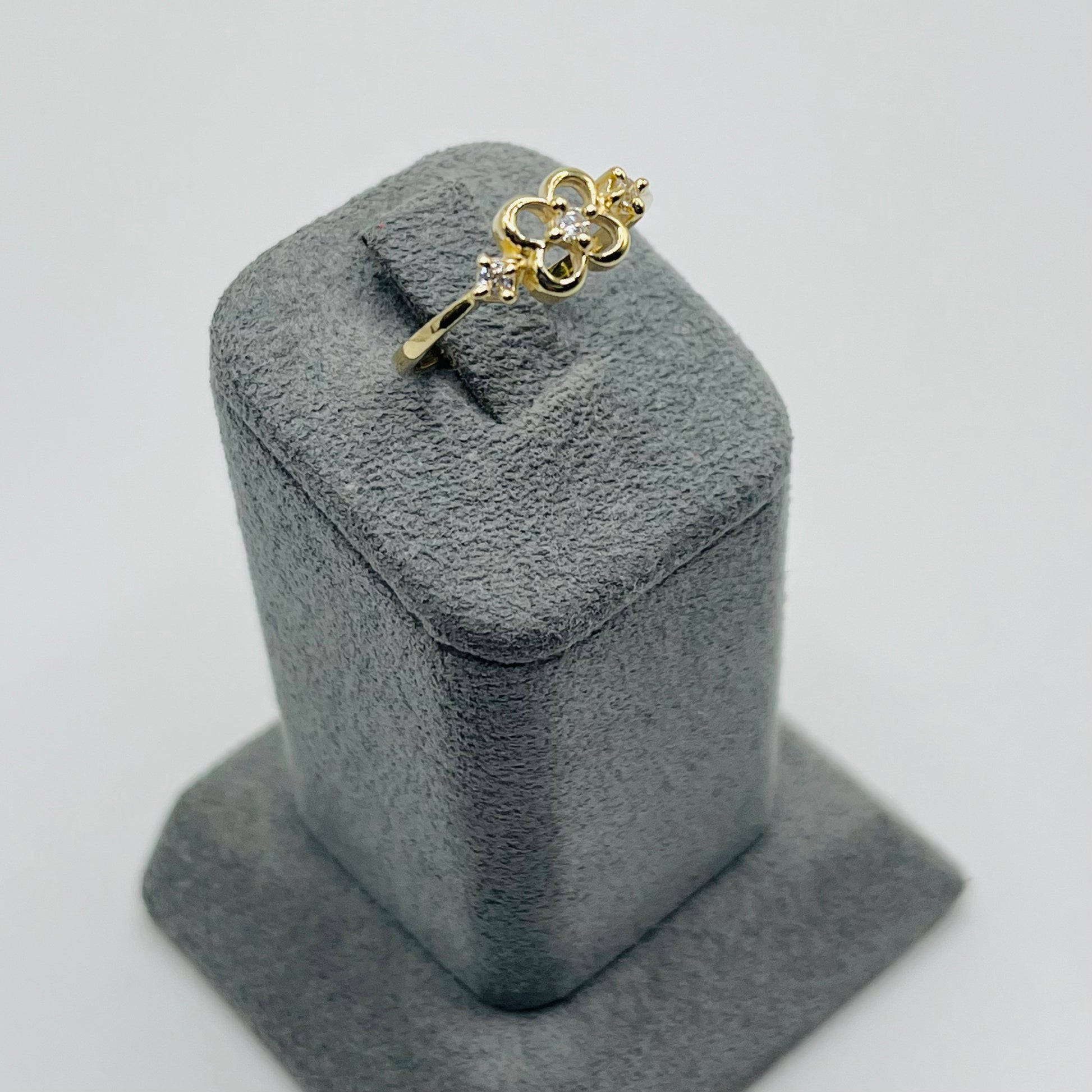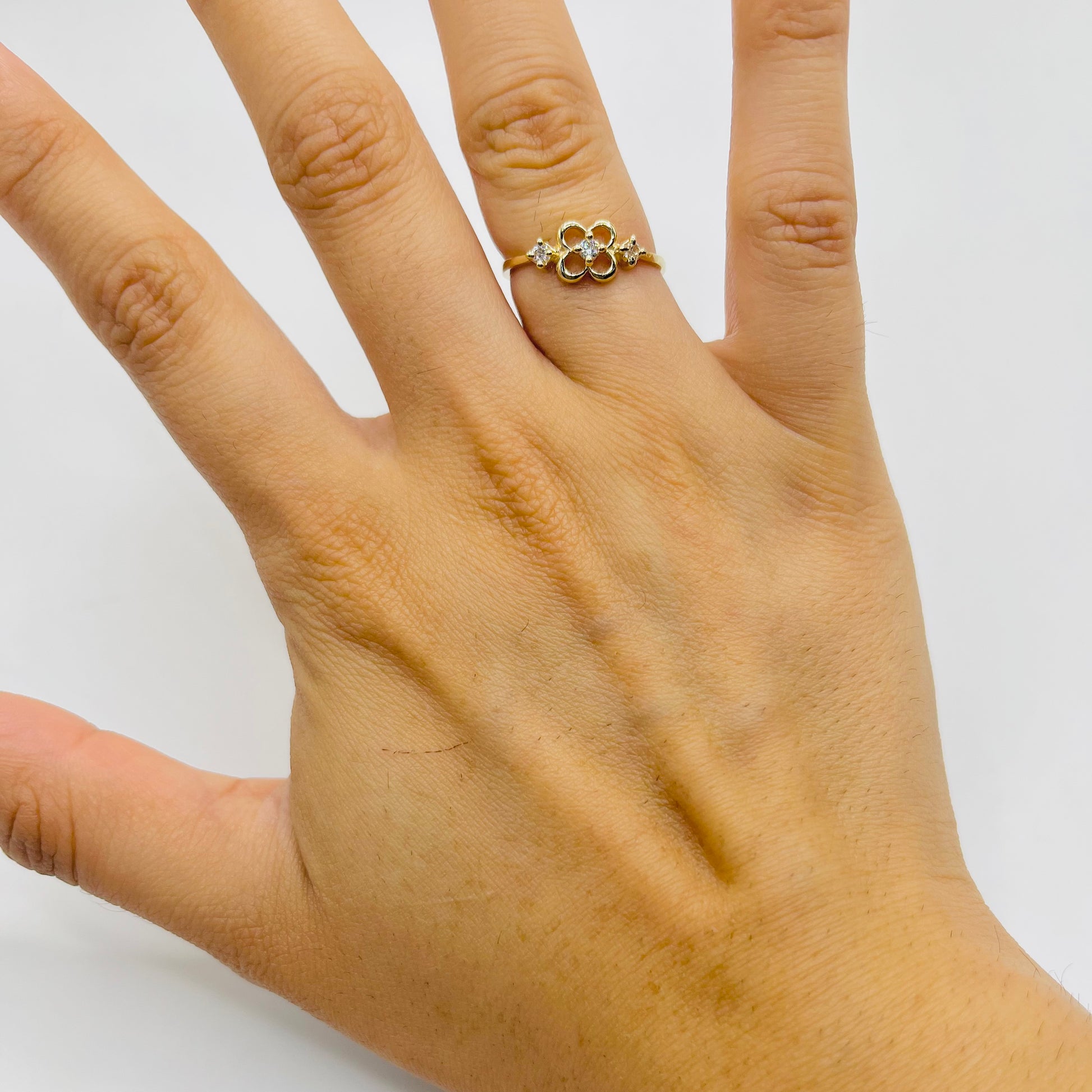 This delicate 14k Gold Delight Ring features a charming flower design adorned with three sparkling cubic zirconia stones. Its dainty style adds a subtle touch of elegance, perfect for everyday wear or special occasions. Embrace timeless beauty and effortless sophistication with this exquisite piece.