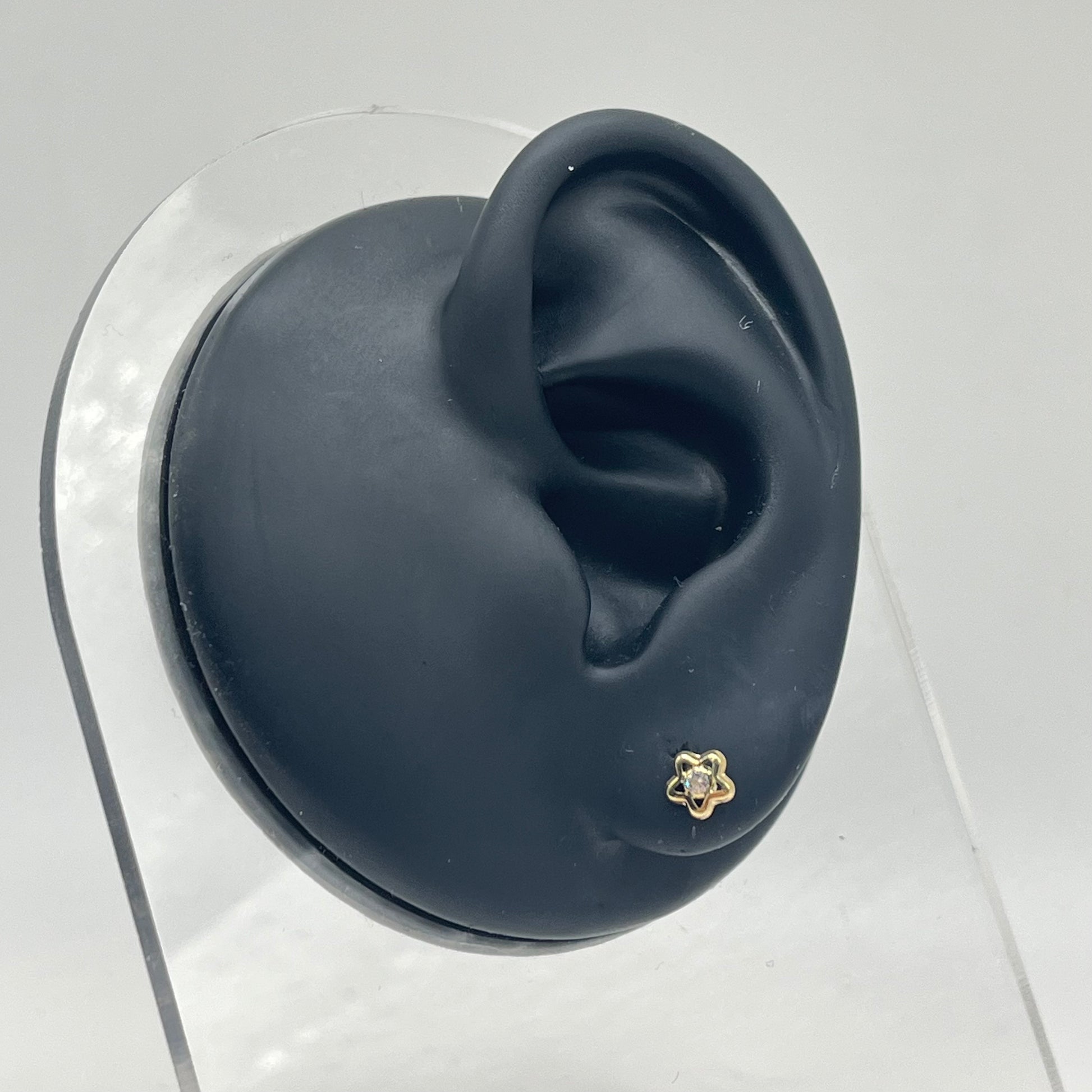 These 14k gold baby earrings feature a shining star design with a secure middle screw back, ensuring they stay comfortably in place. Perfect for delicate ears, they add a touch of elegance and sparkle to any outfit, making them a thoughtful gift for your little one.