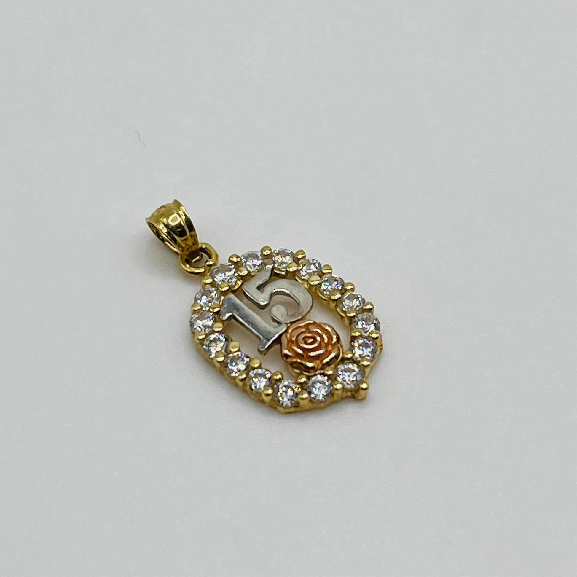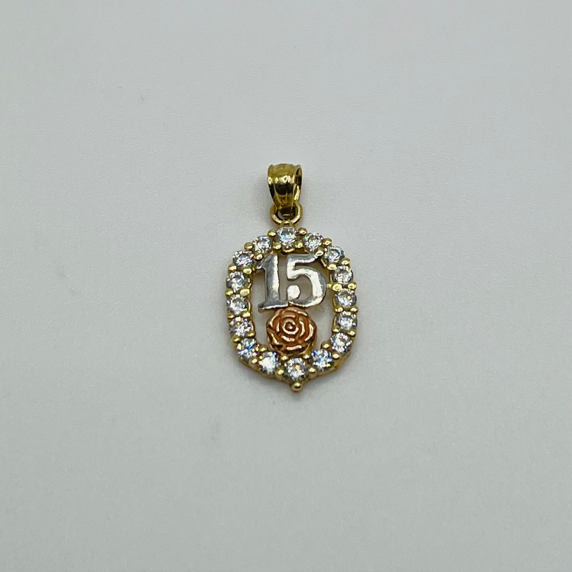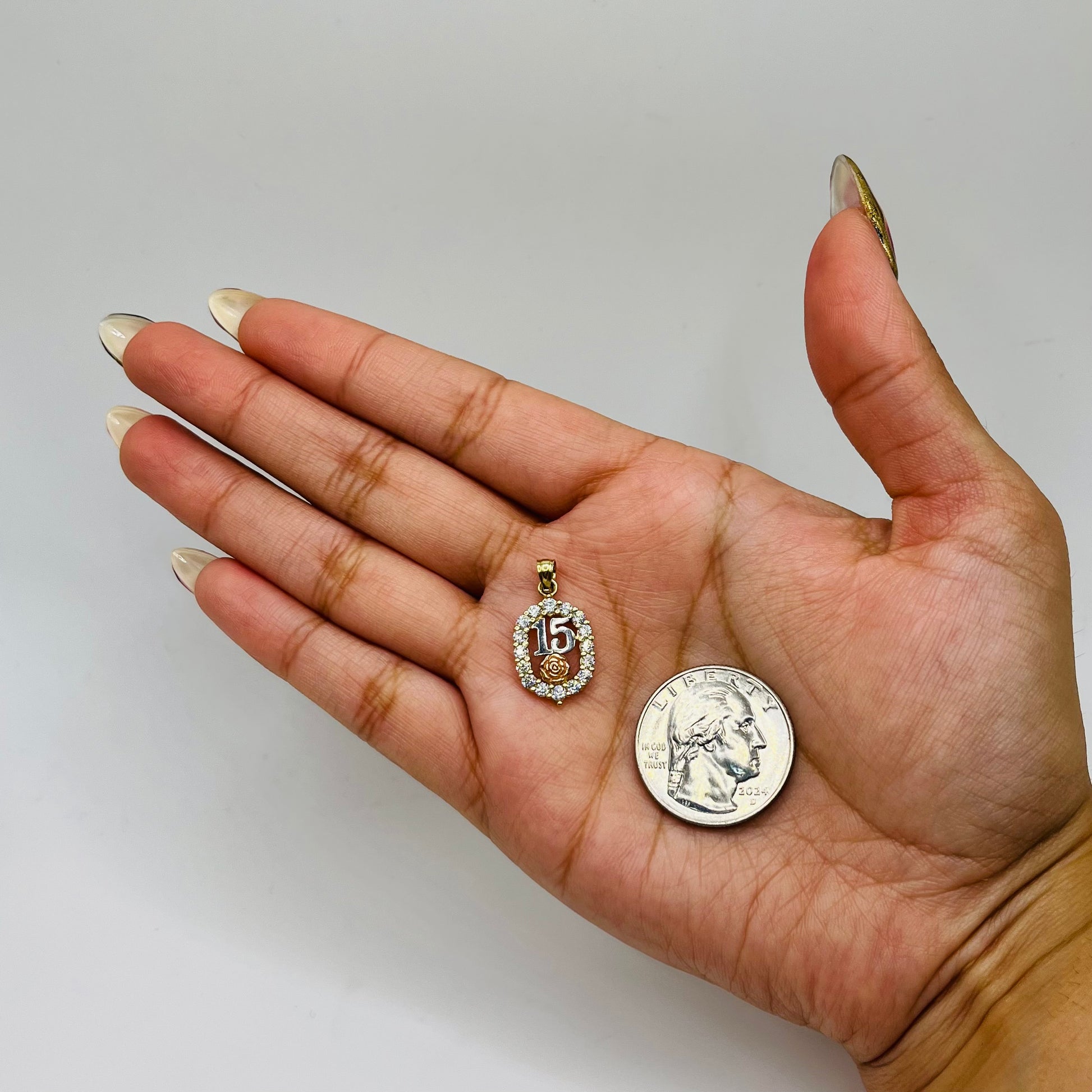 Elevate your style with this exquisite 14k Gold Enchanted Quince Charm, featuring a dazzling round cluster of sparkling cubic zirconia set in yellow gold. In the center, a delicate 15 in white gold with a rose gold rose below it. This pendant adds a touch of romantic elegance, making this piece a perfect blend of modern brilliance and timeless beauty. Ideal for adding a unique sparkle to any outfit or gifting to someone special.