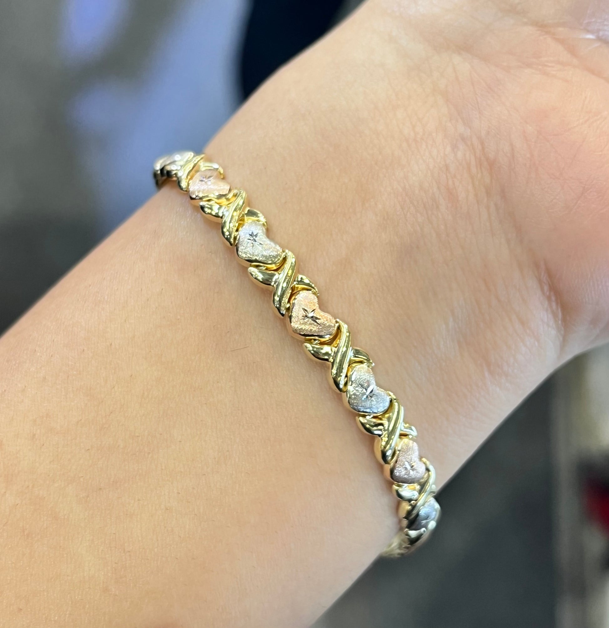 Crafted from solid 14K gold, our Tri-color Hearts XO bracelet is a beauty and sure to elevate your style. Featuring the XO pattern with rose and white gold hearts and intricate detailing this bracelet measures 7 inches long.