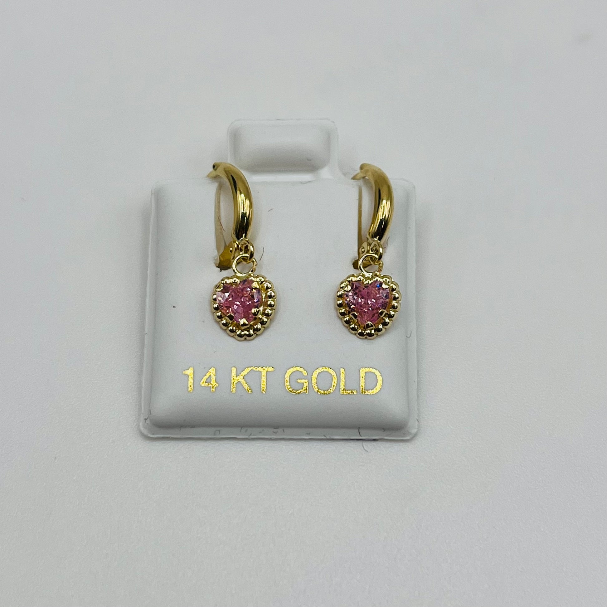 14k Gold Hoop with Dangling Pink Hearts Baby Earrings
