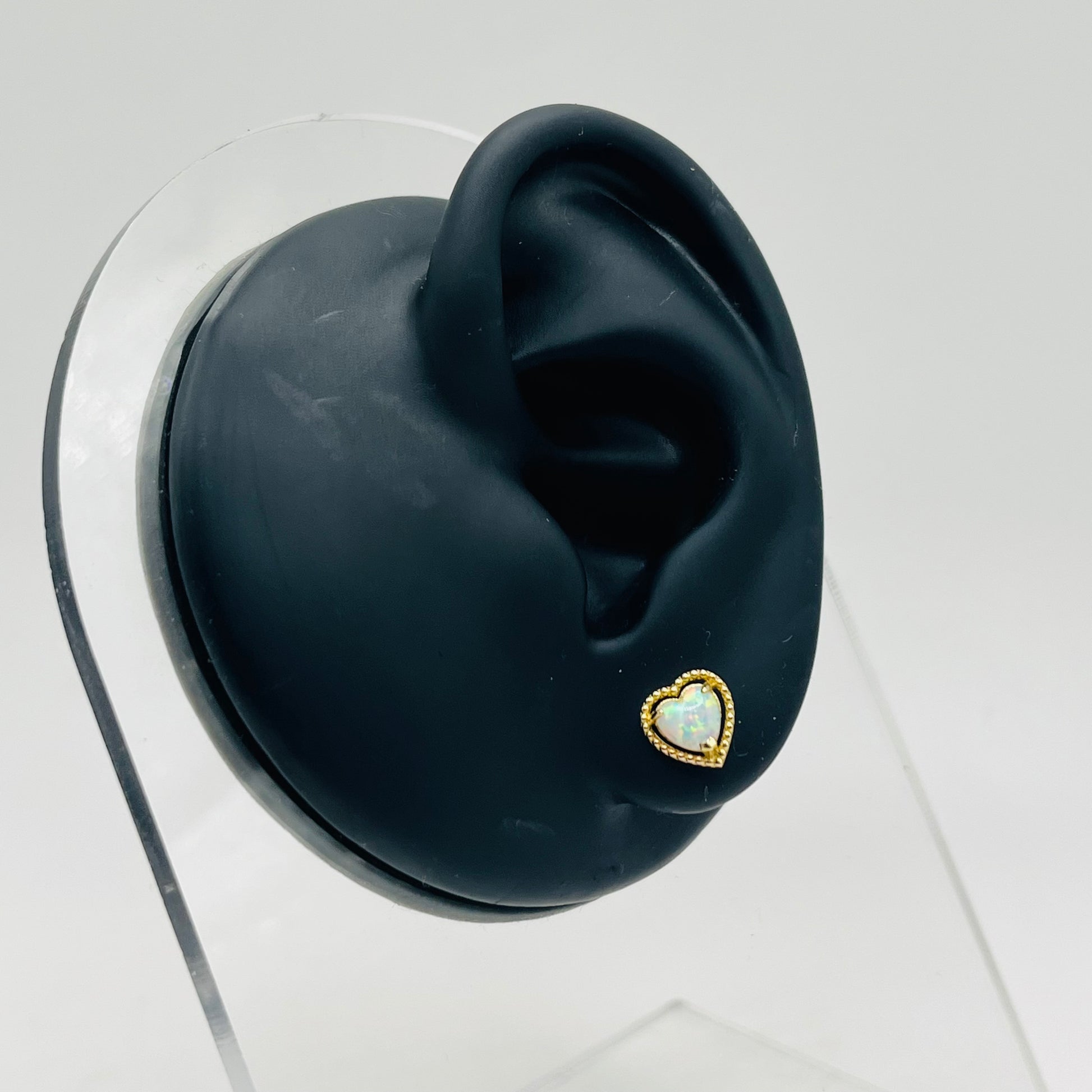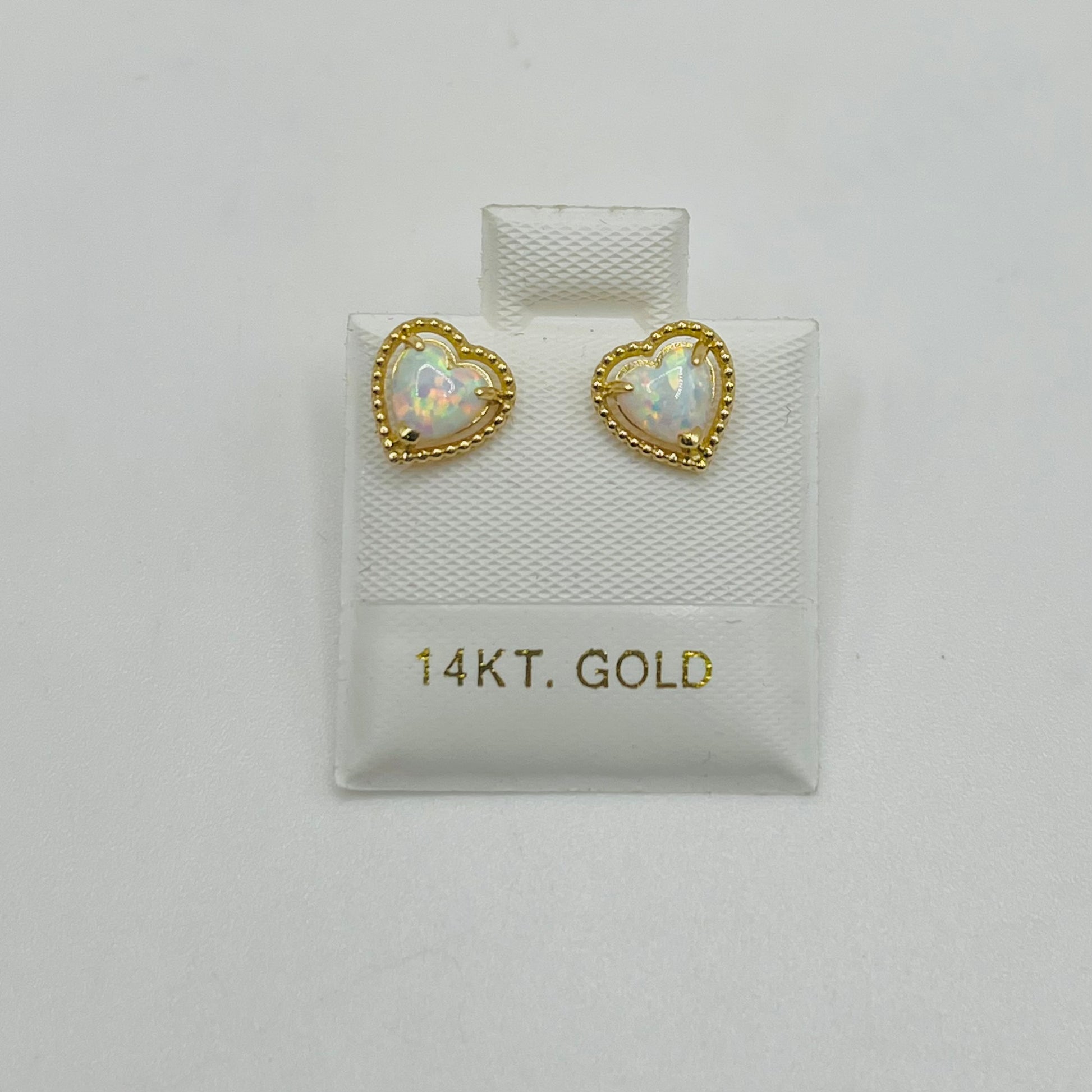 Add to your collection with these stunning 14k Gold Opal Heart Earrings. Crafted from high-quality 14k gold, these delicate heart-shaped earrings showcase mesmerizing opal stones that shimmer with a play of vibrant colors.