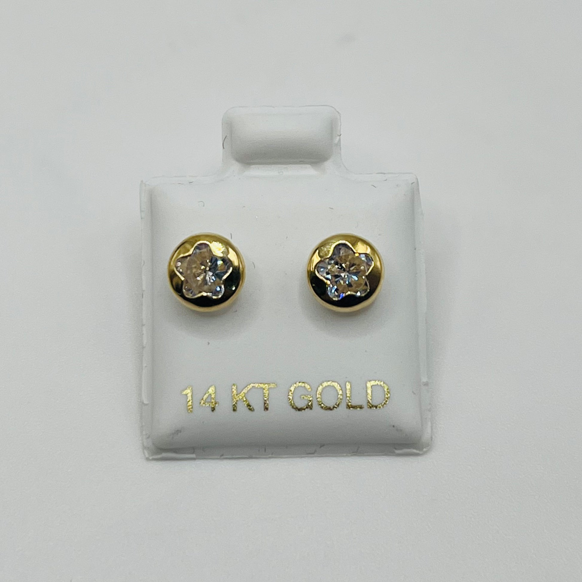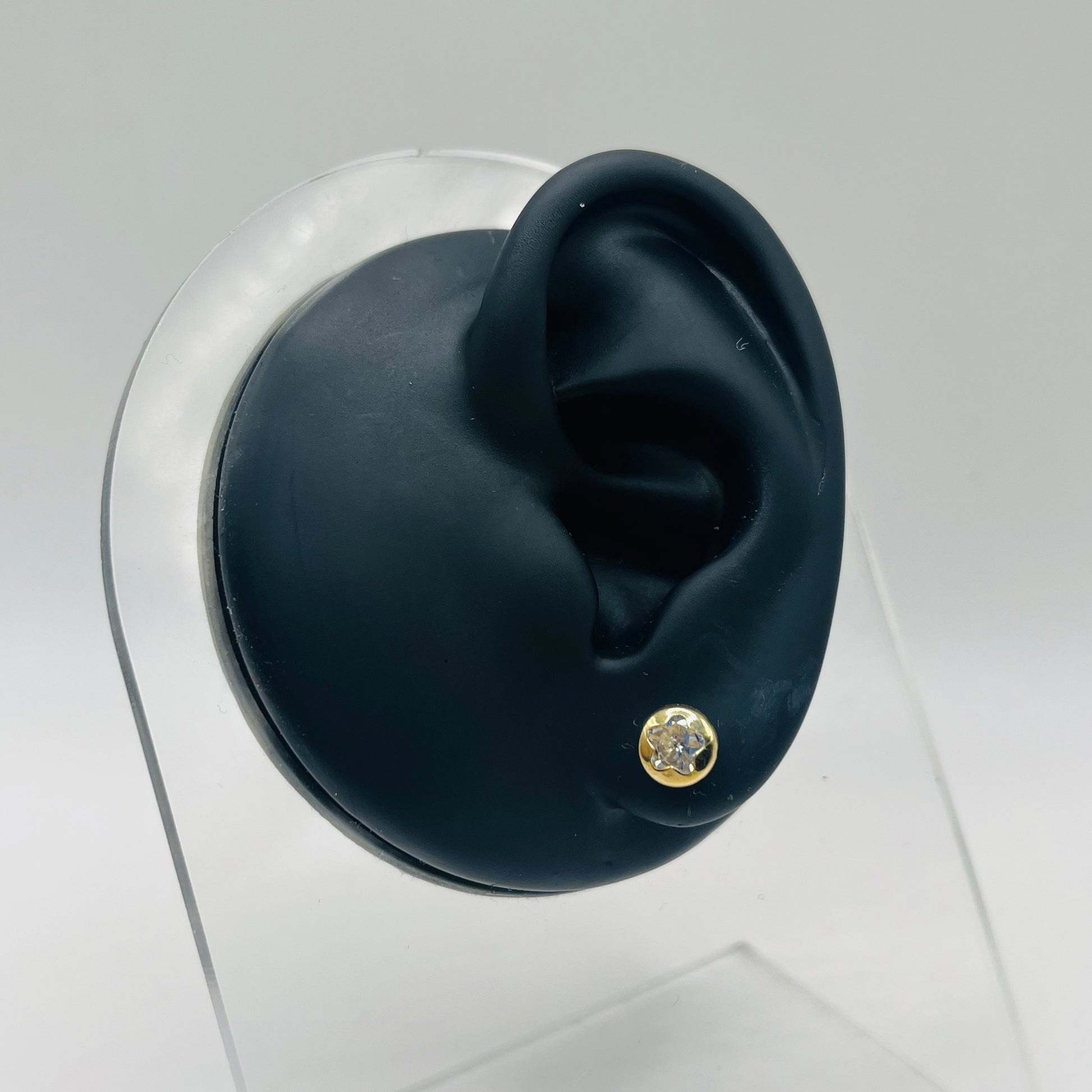 These 14k Gold Round Carved Star Baby Earrings feature a dazzling cubic zirconia stone shaped like a star, securely set in a classic round gold frame. Equipped with screw-back closures, they ensure a comfortable and safe fit for your little one, preventing loss during wear. Elegant and durable, these earrings are perfect for adding a delicate sparkle to any outfit while providing peace of mind for parents.