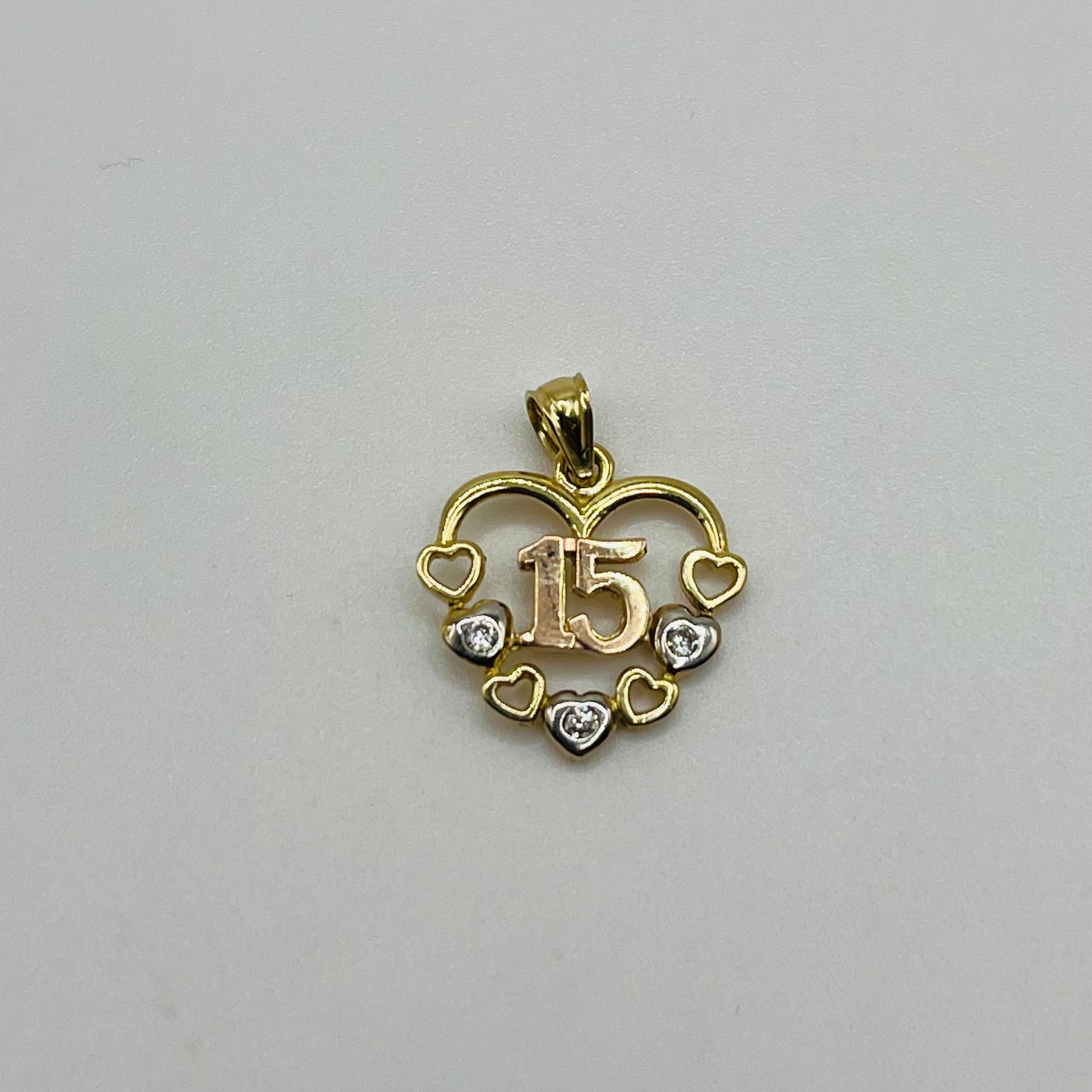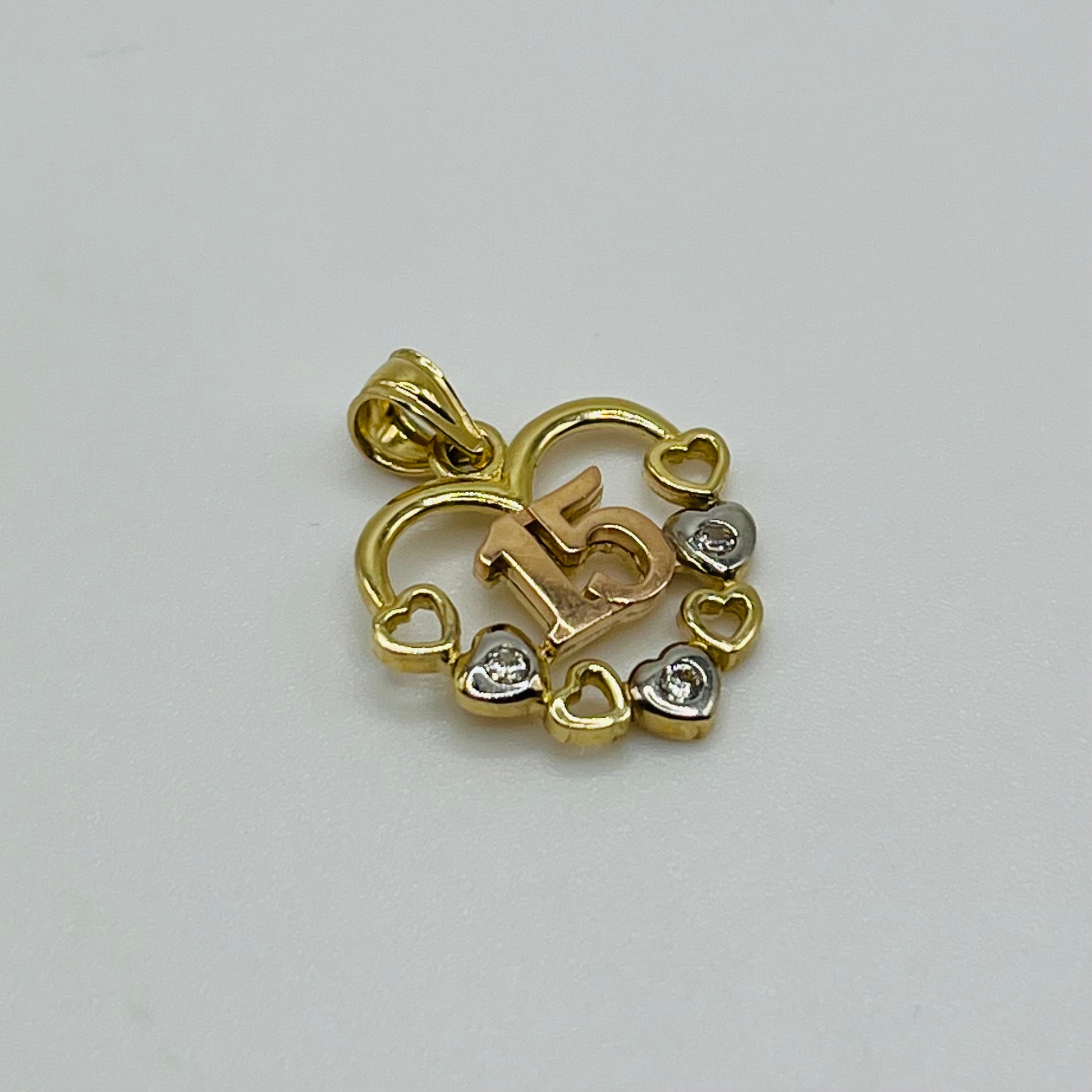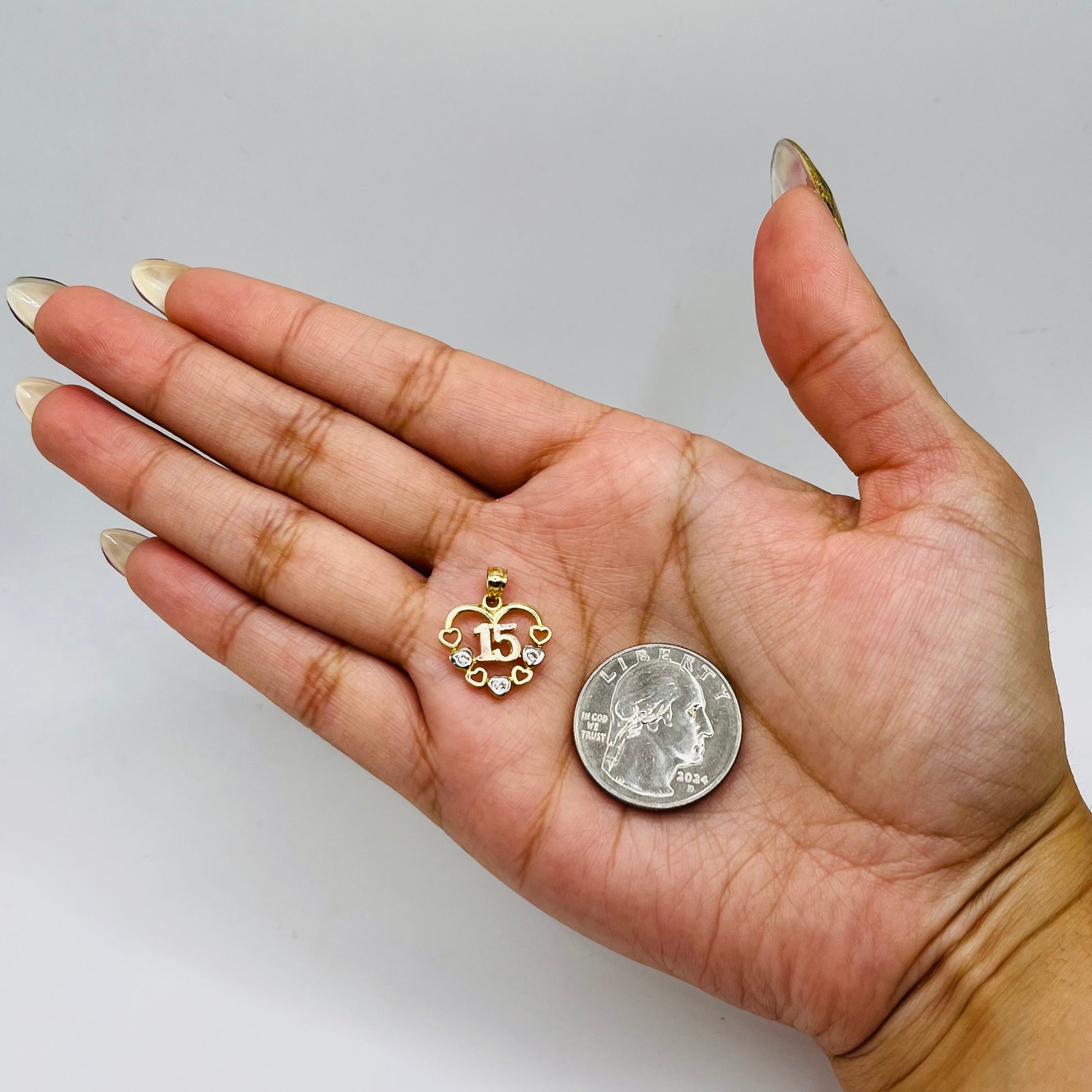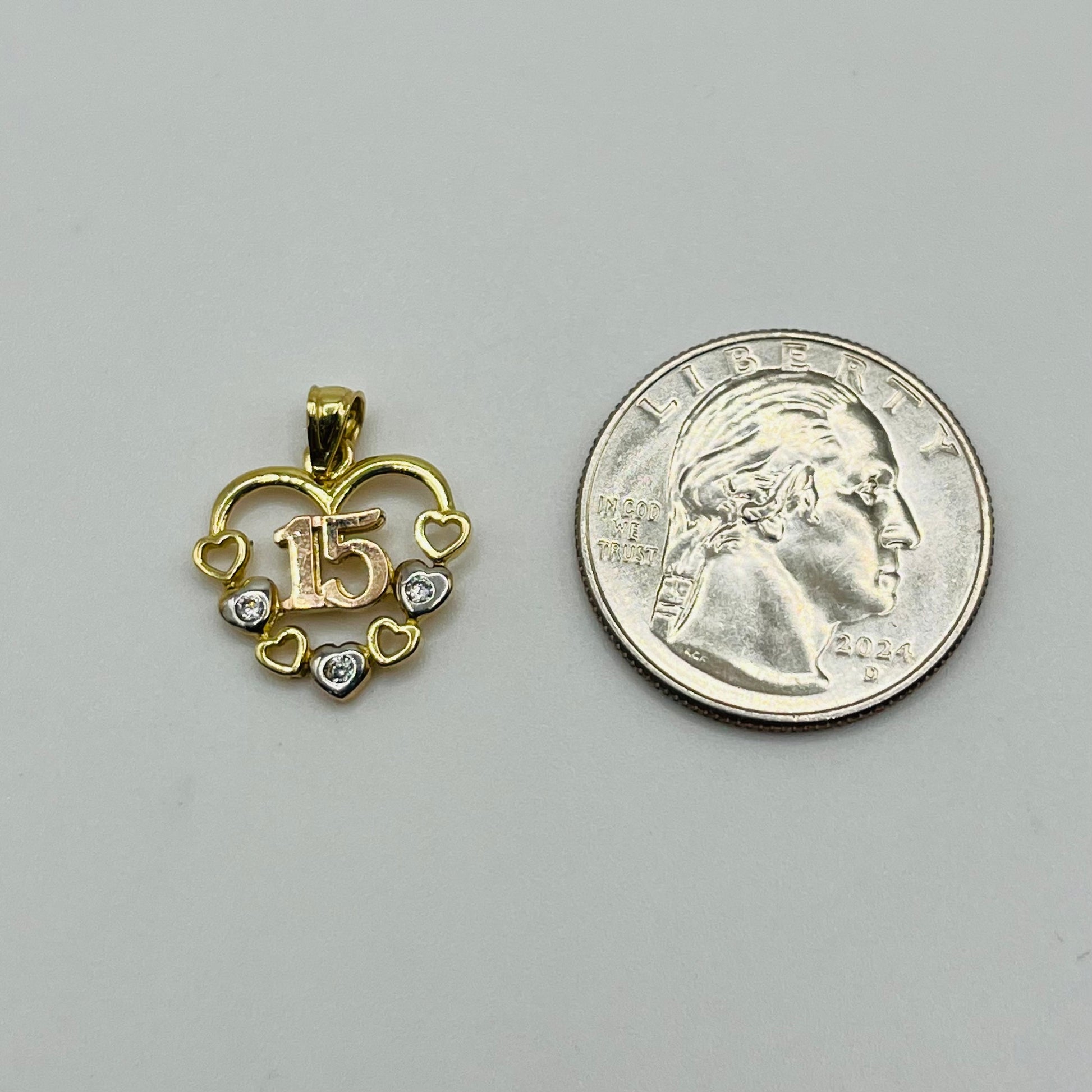 Celebrate love and milestones with this 14k Gold Heart Quince CZ Charm. Featuring tiny hearts gracefully forming a larger heart, with the number 15 at its center, this tricolor charm symbolizes a special quinceañera moment. Its elegant design and sparkling cubic zirconia make it a meaningful keepsake to cherish forever.