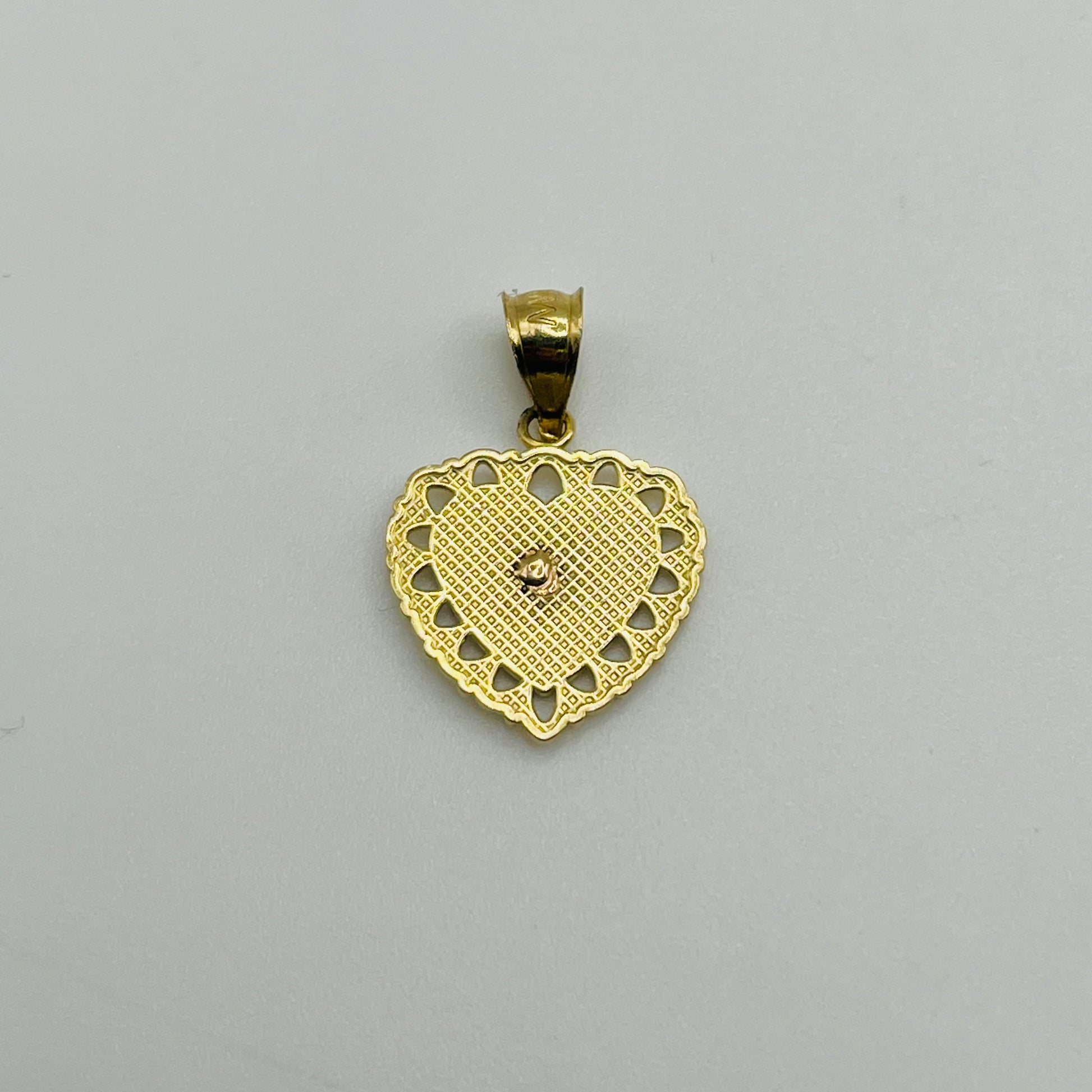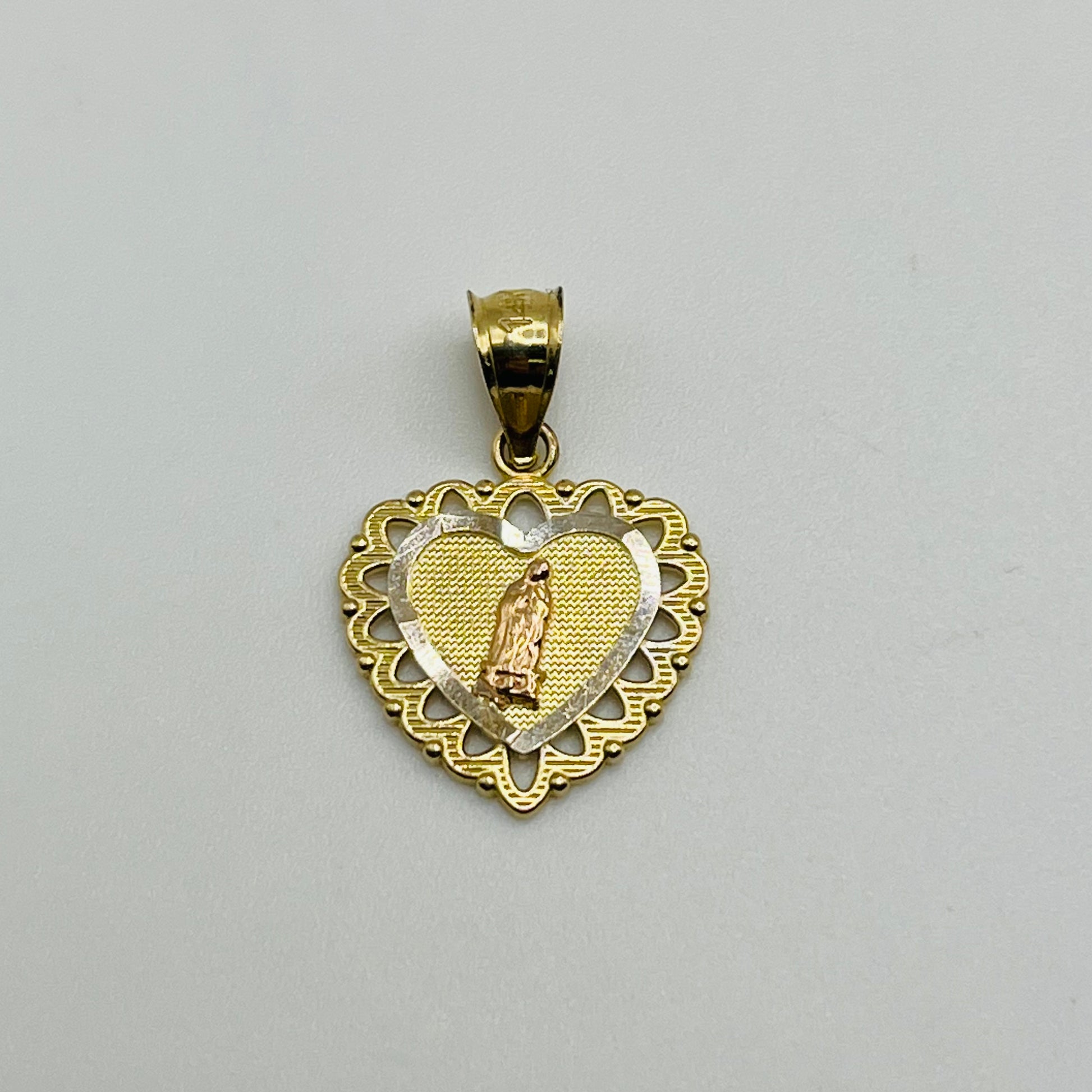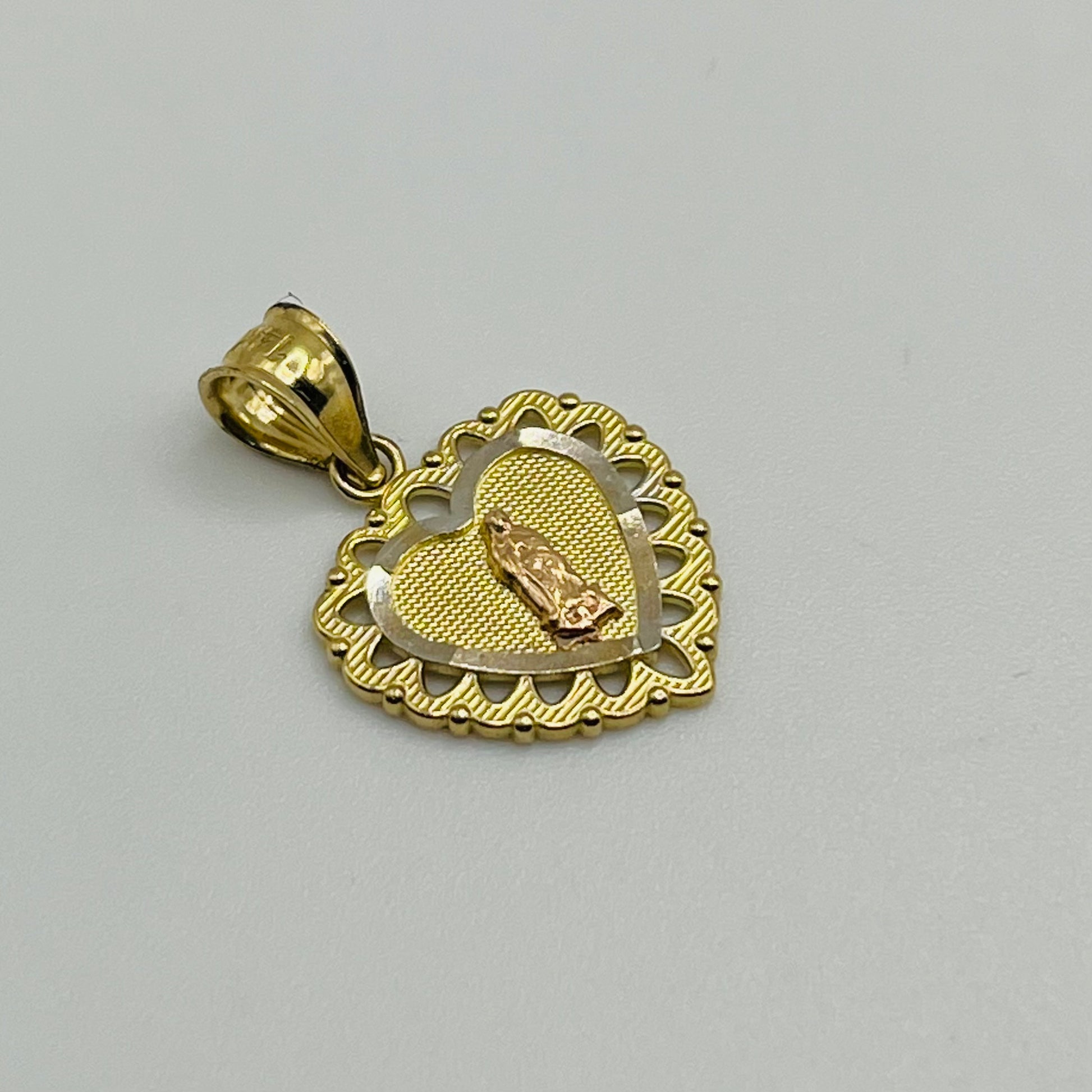 The 14K Gold Tricolor Virgin Mary Heart Charm beautifully blends yellow, white, and rose gold, creating a harmonious and eye-catching piece. With a heart-shaped frame and a detailed depiction of the Virgin Mary at its center, this charm symbolizes love, faith, and devotion in an elegant, multicolored design.
