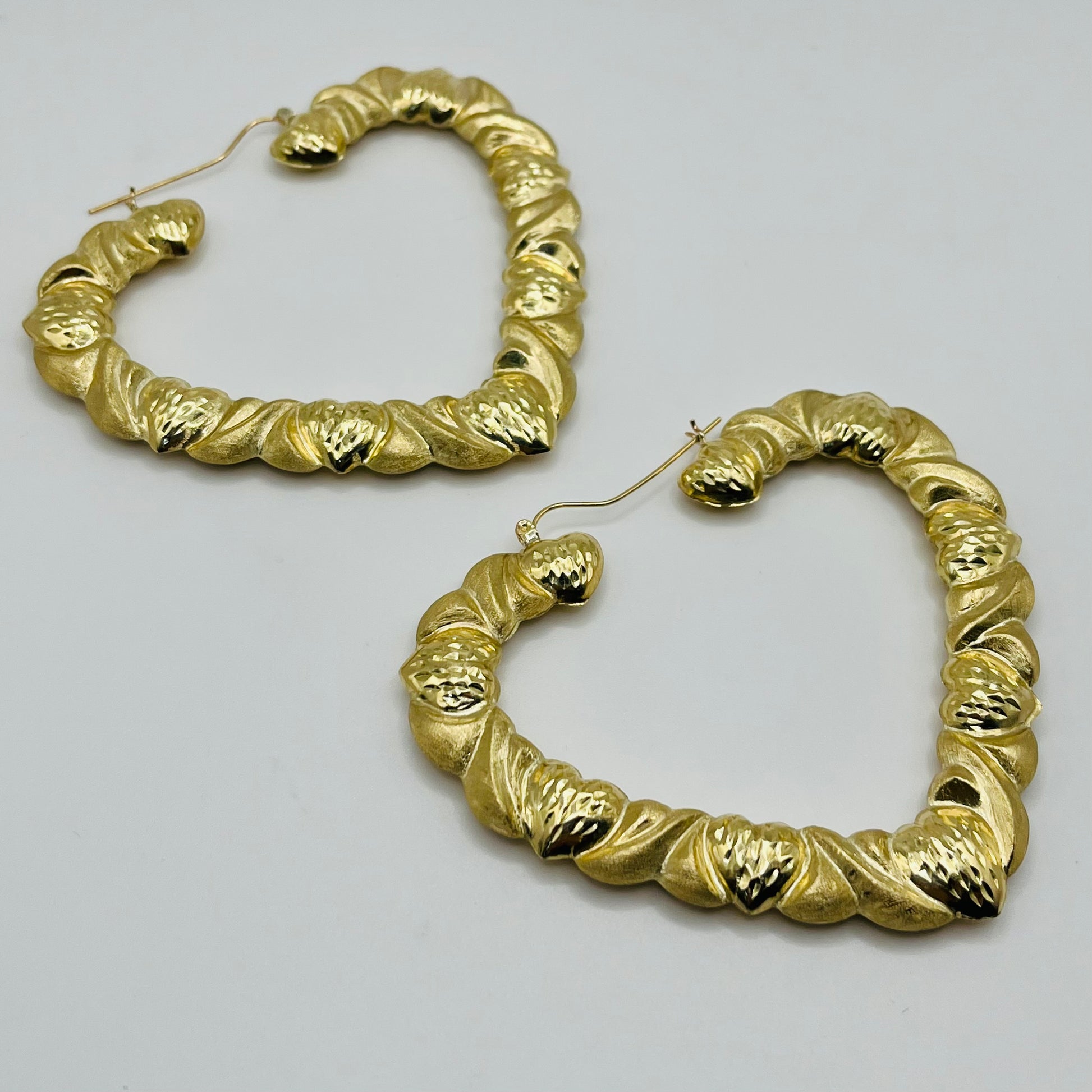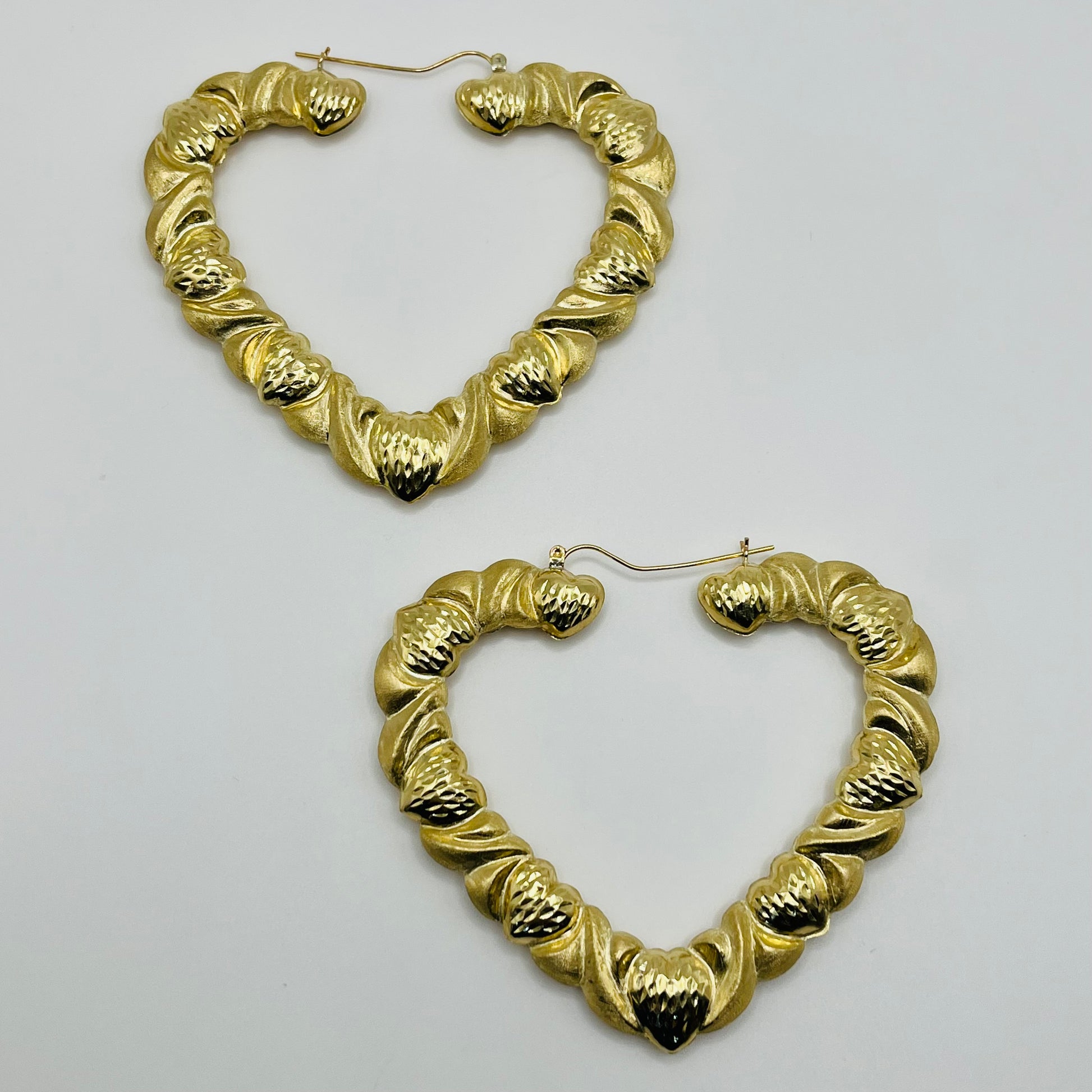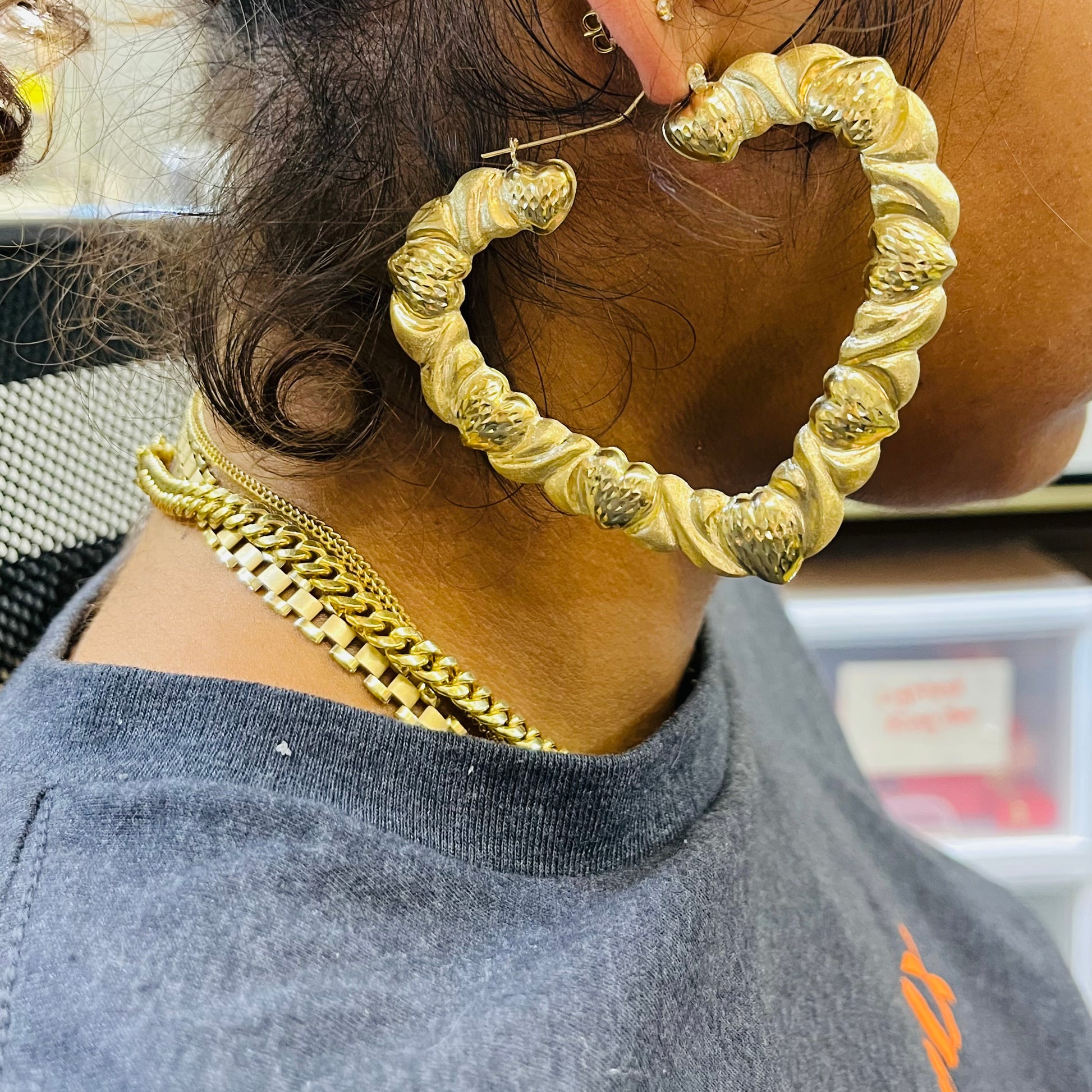 Get ready to steal hearts with these dazzling 3" heart hoop earrings, forged from radiant 10K gold to elevate your urban charm with a touch of feminine allure. Make a bold statement with their eye-catching design, guaranteed to turn heads and spread love wherever your journey takes you.