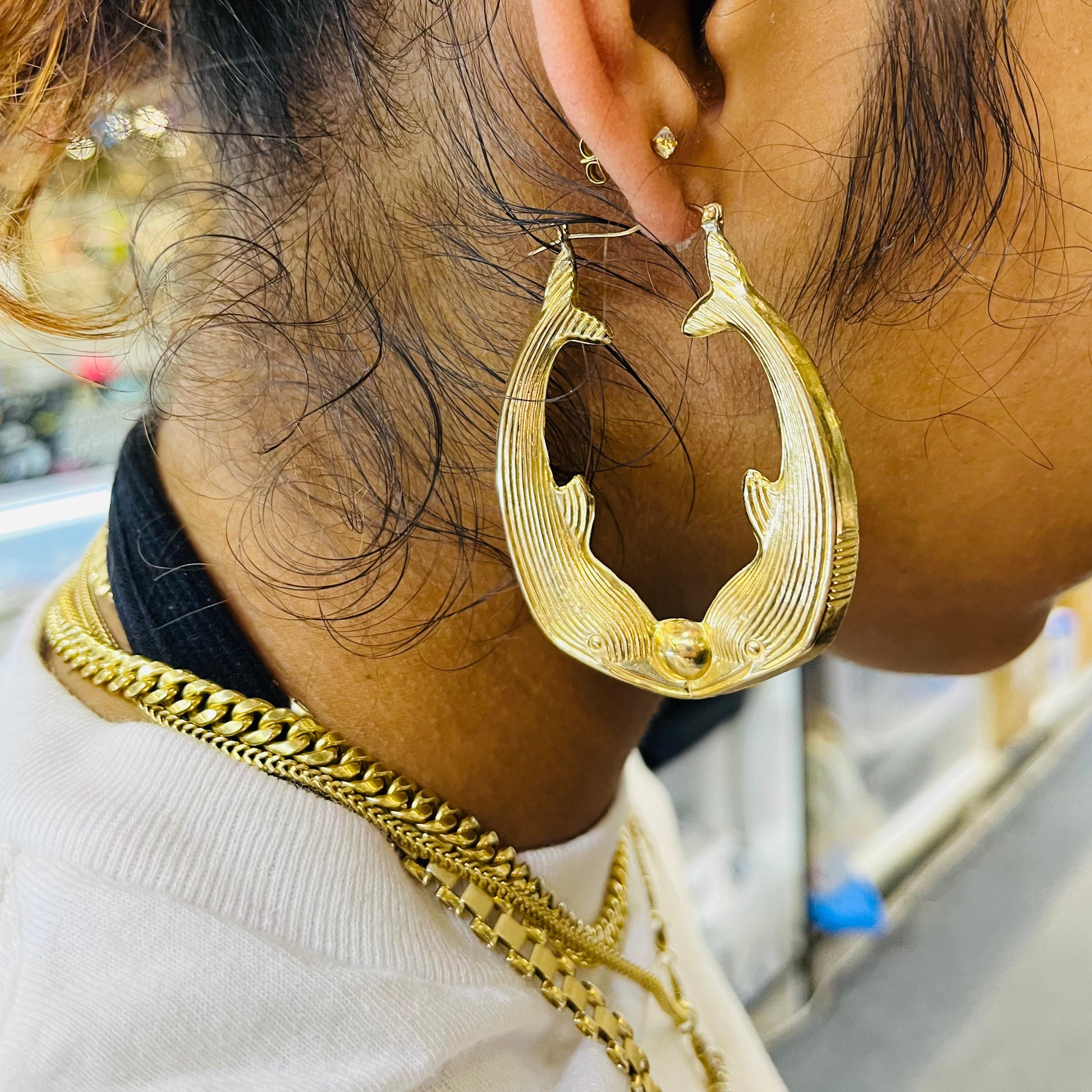Dive into style with our 10K Gold Whale Shaped Hoop Earrings. Crafted with precision and care from genuine 10K gold, these earrings feature a playful yet elegant whale design, making them a unique statement piece. The high-quality gold adds a touch of luxury, ensuring they become a cherished addition to your jewelry collection.