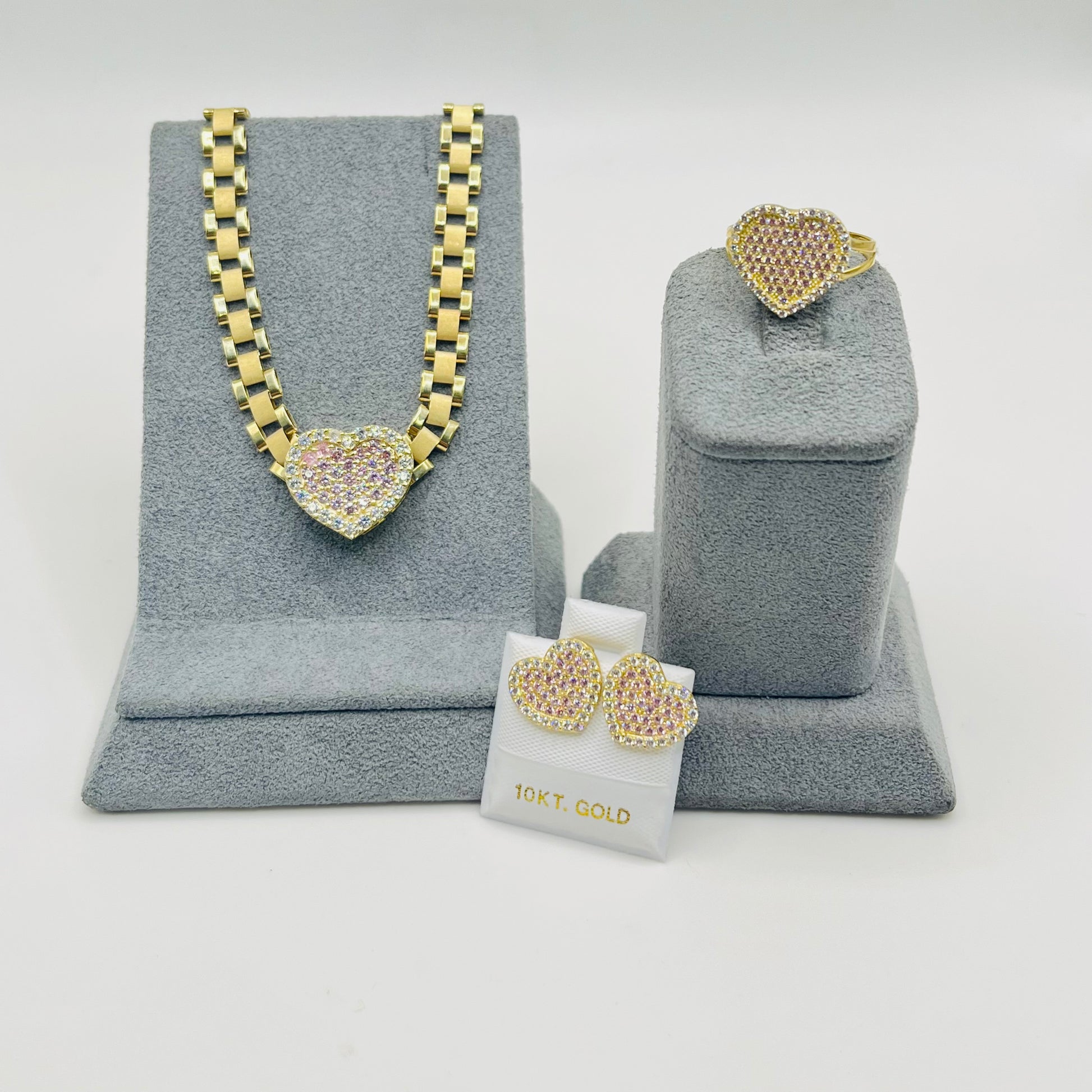 This set includes an 6mm RX chain with a Medium pink cubic zirconia Heart Ring and matching Pink Heart Earrings. To complete the set the chain includes a sliding pink heart charm.